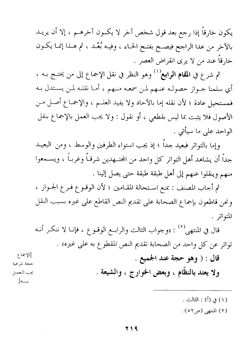قال في المنتهى: «وجوب الثالث والرابع الوقوع, فإنا لا ننكر أنه تتواتر عن كل واحد من الصحابة تقديم النص المقطوع به على غيره».