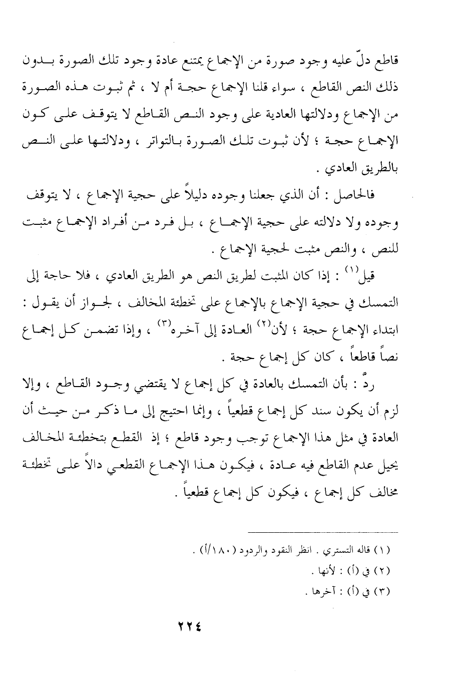 قاطع دلّ عليه وجود صورة من الإجماع يمتنع عادة وجود تلك الصورة بدون ذلك النص القاطع, سواء قلنا الإجماع حجة أم لا, ثم ثبوت هذه الصورة من الإجماع ودلالتها العادية على وجود النص القاطع لا يتوقف على كون الإجماع حجة؛ لأن ثبوت تلك الصورة بالتواتر, ودلالتها على النص بالطريق العادي.