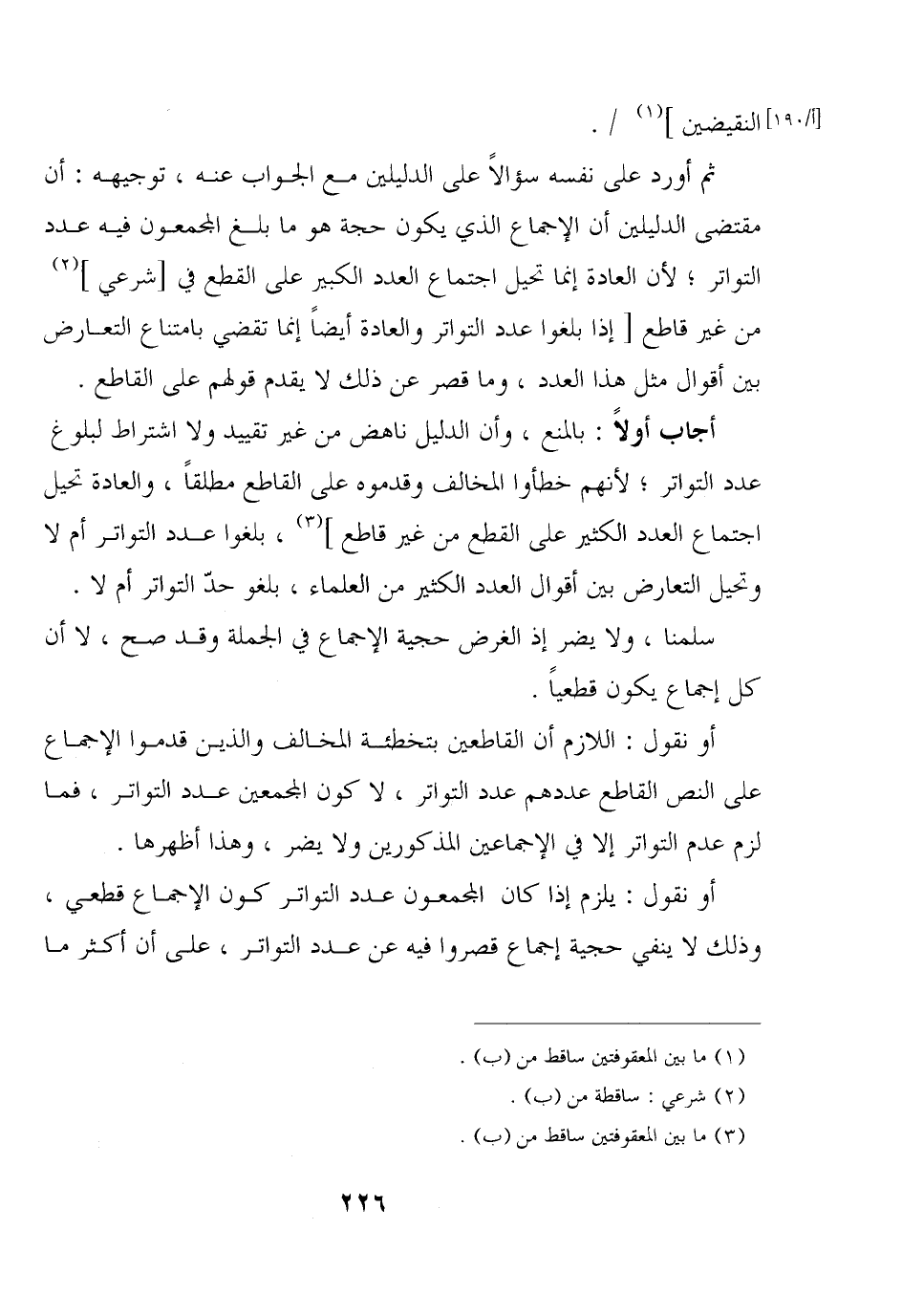أو نقول: اللازم أن القاطعين بتخطئة المخالف والذين قدموا الإجماع على النص القاطع عددهم عدد التواتر, لا كون المجمعين عدد التواتر, فما لزم عدم التواتر إلا في الإجماعين المذكورين ولا يضر, وهذا أظهرها.
