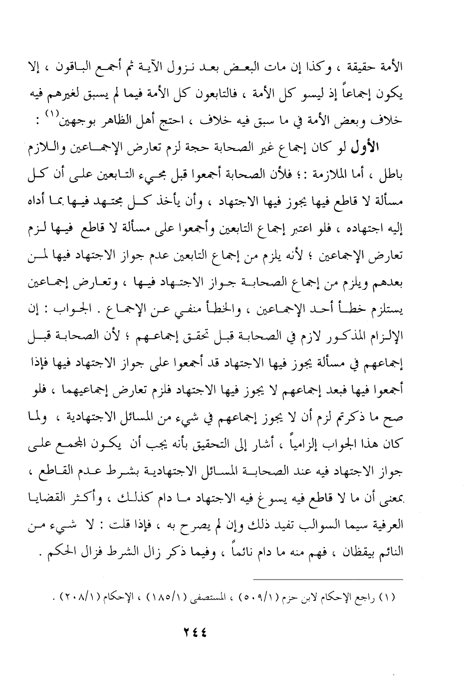 الأمة حقيقة, وكذا إن مات البعض بعد نزول الآية ثم أجمع الباقون, إلا يكون إجماعًا إذ ليسو كل الأمة, فالتابعون كل الأمة فيما لم يسبق لغيرهم فيه خلاف وبعض الأمة في ما سبق فيه خلاف, احتج أهل الظاهر بوجهين: الأول لو كان إجماع غير الصحابة حجة لزم تعارض الإجماعين واللازم باطل, أما الملازمة: ؛ فلأن الصحابة أجمعوا قبل مجيء التابعين على أن كل مسألة لا قاطع فيها يجوز فيها الاجتهاد, وأن يأخذ كل مجتهد فيها بما أداه إليه اجتهاده, فلو اعتبر إجماع التابعين وأجمعوا على مسألة لا قاطع فيها لزم تعارض الإجماعين؛ لأنه يلزم من إجماع التابعين عدم جواز الاجتهاد فيها لمن بعدهم ويلزم من إجماع الصحابة جواز الاجتهاد فيها, وتعارض إجماعين يستلزم خطأ أحد الإجماعين, والخطأ منفي عن الإجماع. الجوةاب: إن الإلزام المذكور لازم في الصحابة قبل تحقق إجماعهم؛ لأن الصحابة قبل إجماعهم في مسألة يجوز فيها قد أجمعوا على جواز الاجتهاد فيها فإذا أجمعوا فيها فبعد إجماعهم لا يجوز فيها الاجتهاد فلزم تعارض إجماعيهما, فلو صح ما ذكرتم لزم أن لا يجوز إجماعهم في شيء من المسائل الاجتهادية, ولما كان هذا الجواب إلزاميًا, أشار إلى التحقيق بأنه يجب أن يكون المجمع على جواز الاجتهاد فيه عند الصحابة المسائل الاجتهادية بشرط عدم القاطع, بمعنى أن ما لا قاطع فيه يسوغ فيه الاجتهاد ما دام كذلك, وأكثر القضايا العرفية سيما السوالب تفيد ذلك وإن لم يصرح به, فإذا قلت: لا شيء من النائم بيقظان, فهم منه ما دام نائمًا, وفيما ذكر زال الشرط فزال الحكم.