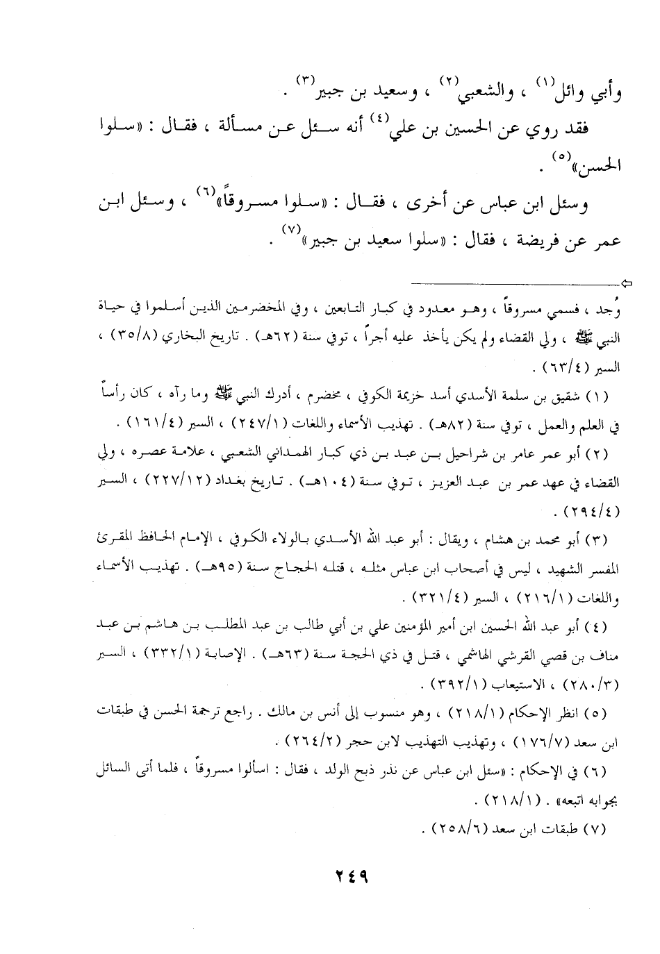 وسئل ابن عباس عن أخرى, فقال: «سلوا مسروقًا» , وسئل ابن عمر عن فريضة, فقال: «سلوا سعيد بن جبير».