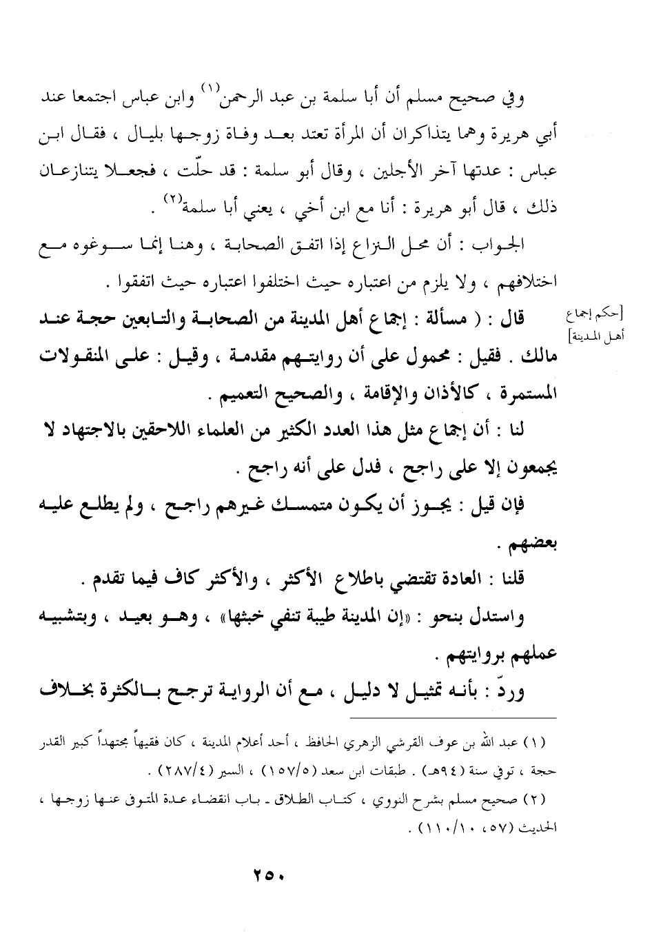 قال: (مسألة: إجماع أهل المدينة من الصحابة والتابعين حجة عند مالك. فقيل: محمول على أن روايتهم مقدمة, وقيل: على المنقولات المستمرة, كالأذان والإقامة, والصحيح التعميم.
