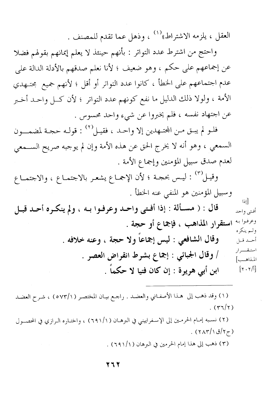 قال: (مسألة: إذا أفتى واحد وعرفوا به, ولم ينكره أحد قبل استقرار المذاهب, فإجماع أو حجة.