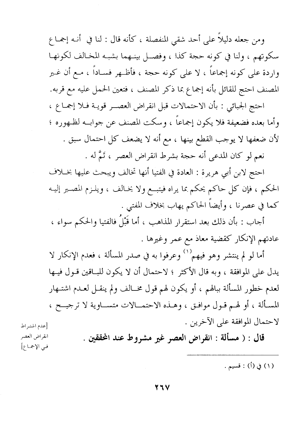 قال: (مسألة: انقراض العصر غير مشروط عند المحققين.