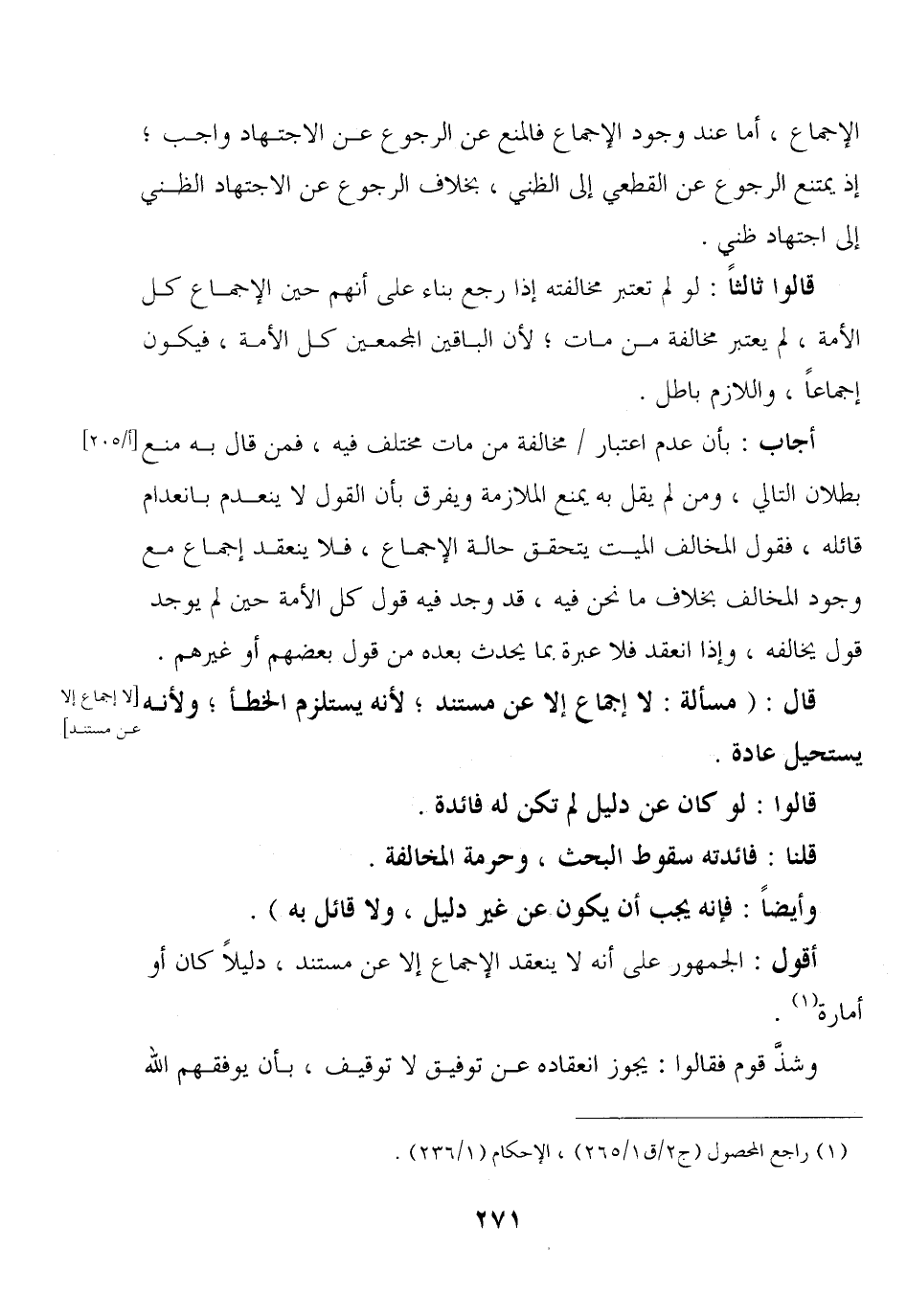 قال: (مسألة: لا إجماع إلا عند مستند؛ لأنه يستلزم الخطأ؛ ولأنه يستحيل عادة.