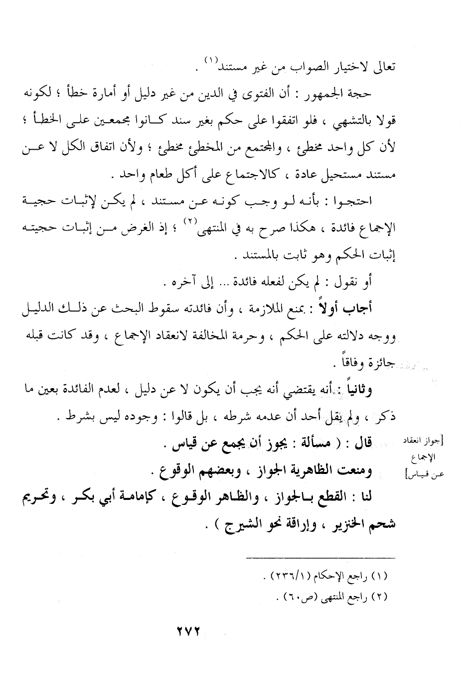 احتجوا: بأنه لو وجب كونه عن مستند, لم يكن لإثبات حجية الإجماع فائدة, هكذا صرح به في المنتهى؛ إذ الغرض من إثبات حجيته إثبات الحكم وهو ثابت بالمستند.