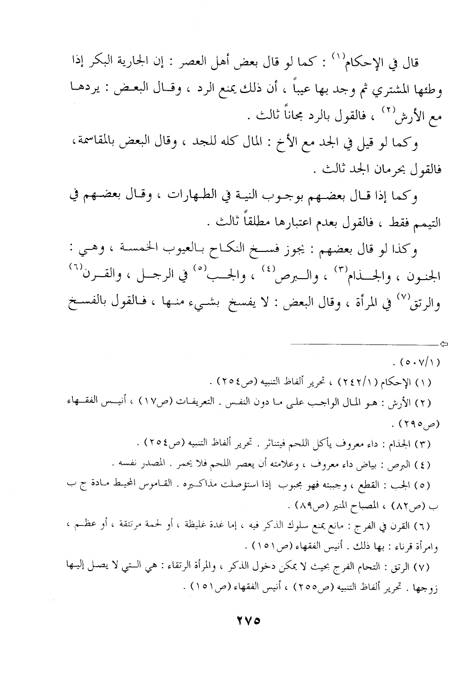 قال في الإحكام: كما لو قال بعض أهل العصر: إن الجارية البكر إذا وطئها المشتري ثم وجد بها عيبًا, أن ذلك يمنع الرد, وقال البعض: يردها مع الأرش, فالقول بالرد مجانًا ثالث.