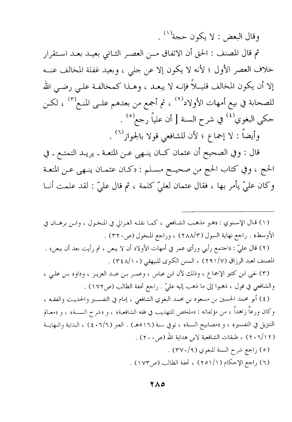 ثم قال المصنف: الحق أن الاتفاق من العصر الثاني بعيد بعد استقرار خلاف العصر الأول؛ لأنه لا يكون إلا عن جلي, وبعيد غفلة المخالف عنه إلا أن يكون المخالف قليلًا فإنه لا يبعد, وهذا كمخالفة علي رضي الله للصحابة في بيع أمهات الأولاد, ثم أجمع من بعدهم على المنع, لكن حكى البغوي في شرح السنة [أن عليًا رجع.