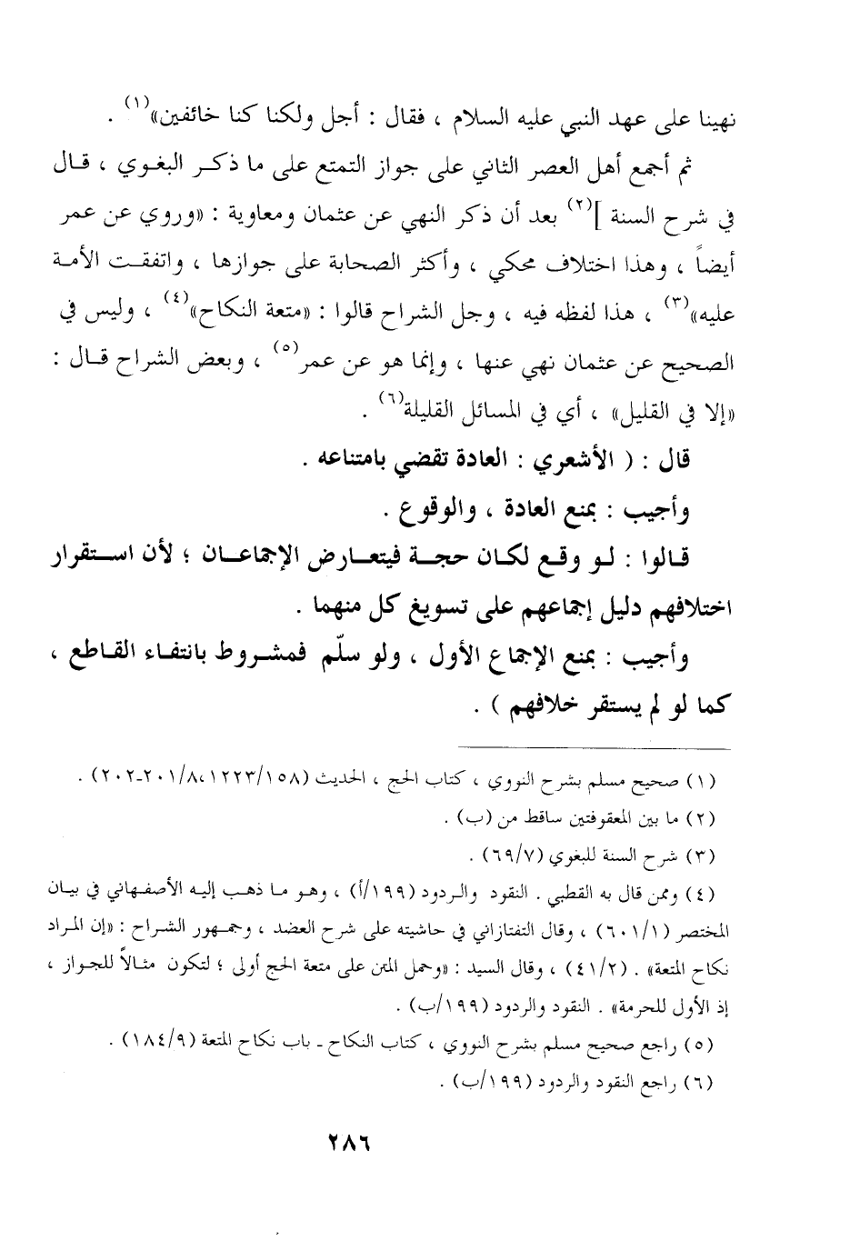 ثم أجمع أهل العصر الثاني على جواز التمتع على ما ذكر البغوي, قال في شرح السنة] بعد أن ذكر النهي عن عثمان ومعاوية: «وروي عن عمر أيضًا, وهذا اختلاف محكي, وأكثر الصحابة على جوازها, واتفقت الأملة عليه» , هذا لفظه فيه, وجل الشراح قالوا: «متعة النكاح» , وليس في الصحيح عن عثمان نهي عنها, وإنما هو عن عمر, وبعض الشراح قال: «إلا في القليل» , أي في المسائل القليلة.
