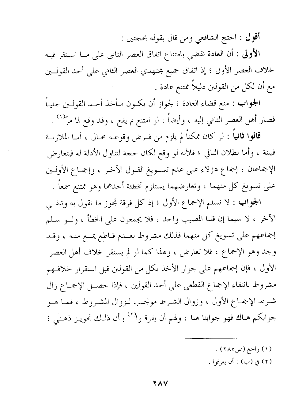 الأولى: أن العادة تقضي بامتناع اتفاق العصر الثاني على ما استقر فيه خلاف العصر الأول؛ إذ اتفاق جميع مجتهدي العصر الثاني على أحد القولين مع أن لكل من القولين دليلًا ممتنع عادة.