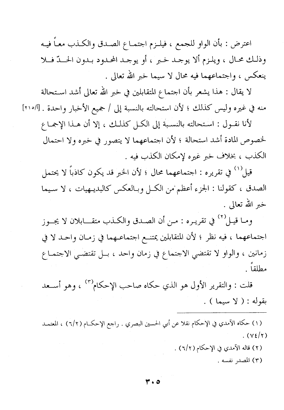 لا يقال: هذا يشعر بأن اجتماع المتقابلين في خبر الله تعالى أشد استحالة منه في غيره وليس كذلك؛ لأن استحالته بالنسبة إلى / جميع الأخبار واحدة. لأنا نقول: استحالته بالنسبة إلى الكل كذلك, إلا أن هذا الإجماع لخصوص المادة أشد استحالة؛ لأن اجتماعهما لا يتصور في خبره ولا احتمال الكذب, بخلاف خبر غيره لإمكان الكذب فيه.
