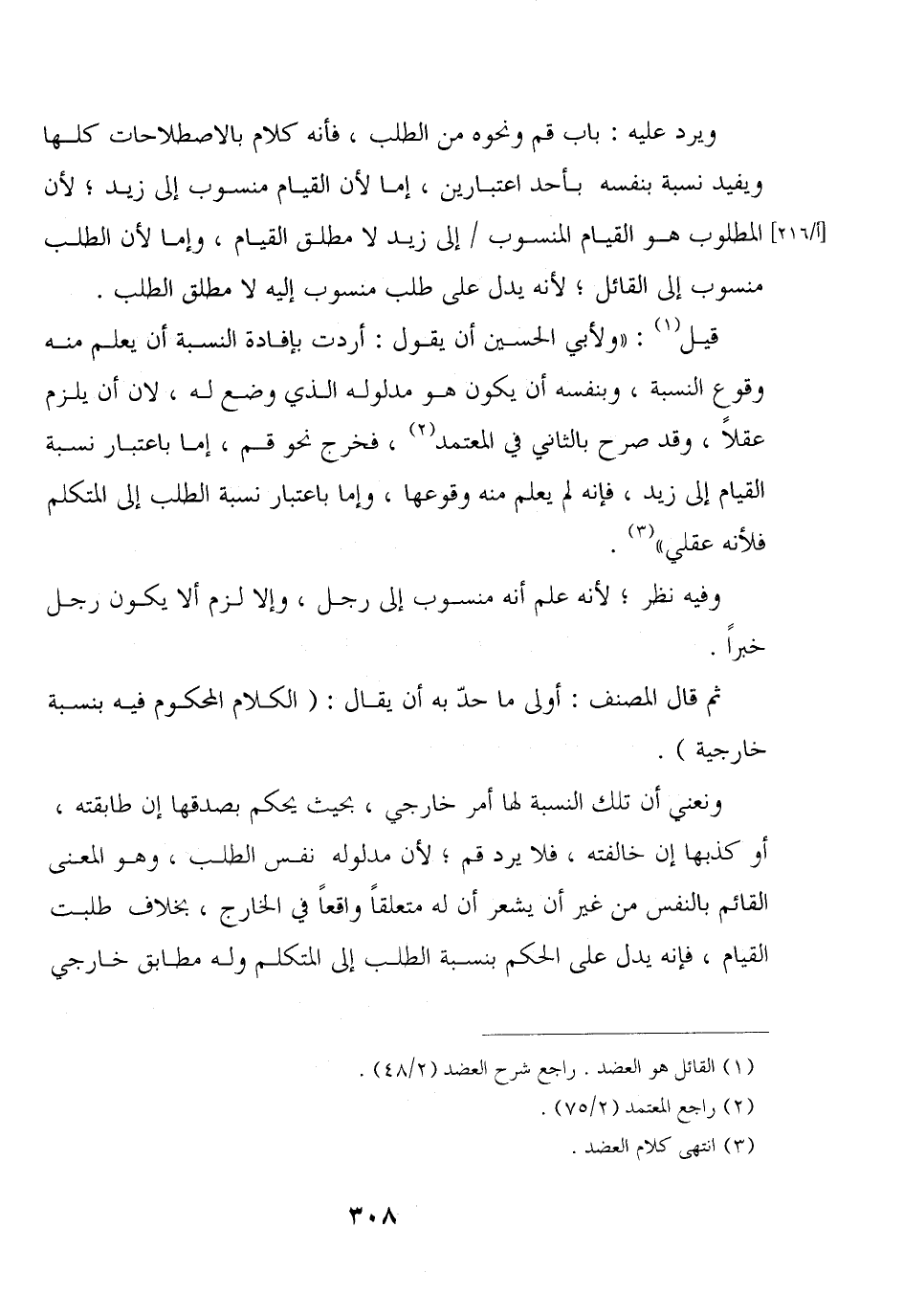 قيل: «ولأبي الحسين أن يقول: أردت بإفادة النسبة أن يعلم منه وقوع النسبة, وبنفسه أن يكون هو مدلوله الذي وضع له, لأن أن يلزم عقلًا, وقد صرح بالثاني في المعتمد, فخرج نحو قم, إما باعتبار نسبة القيام إلى زيد, فإنه لم يعلم منه وقوعها, وإما باعتبار نسبة الطلب إلى المتكلم فلأنه عقلي».
