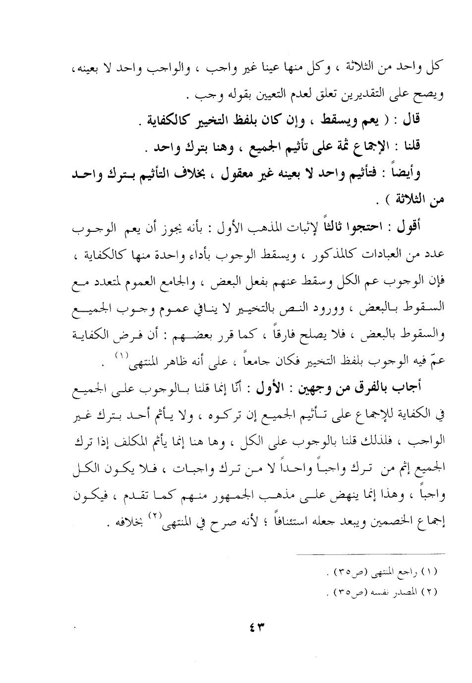 أجاب بالفرق من وجهين: الأول: أنّا إنما قلنا بالوجوب على الجميع في الكفاية للإجماع على تأثيم الجميع إن تركوه, ولا يأثم أحد بترك غير الواجب, فلذلك قلنا: بالوجوب على الكل, وها هنا إنما يأثم المكلف إذا ترك الجميع إثم من ترك واجبًا واحدًا لا من ترك واجبات, فلا يكون الكل واجبًا, وهذا إنما ينهض على مذهب الجمهور منهم كما تقدم, فيكون إجماع الخصمين ويبعد جعله استئنافًا؛ لأنه صرح في المنتهى بخلافه.