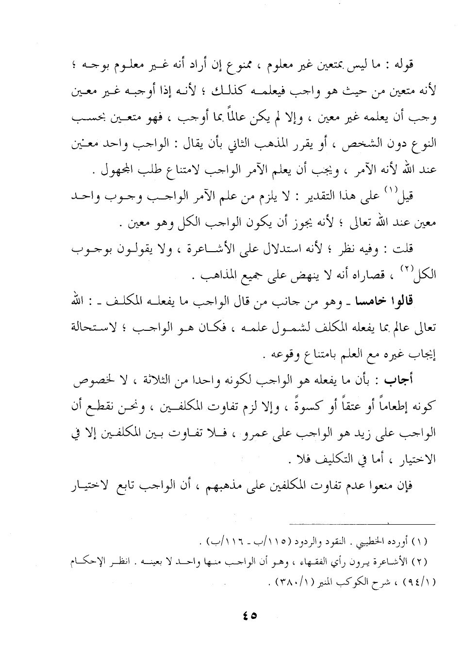 قوله: ما ليس بمتعين غير معلوم, ممنوع إن أراد أنه غير معلوم بوجه؛ لأنه متعين من حيث هو واجب فيعلمه كذلك؛ لأنه إذا أوجبه غير معين وجب أن يعلمه غير معين, وإلا لم يكن عالمًا بما أوجب, فهو متعين بحسب النوع دون الشخص, أو يقرر المذهب الثاني بأن يقال: الواجب واحد معين عند الله لأنه الآمر, ويجب أن يعلم الآمر الواجب لامتناع طلب المجهول.