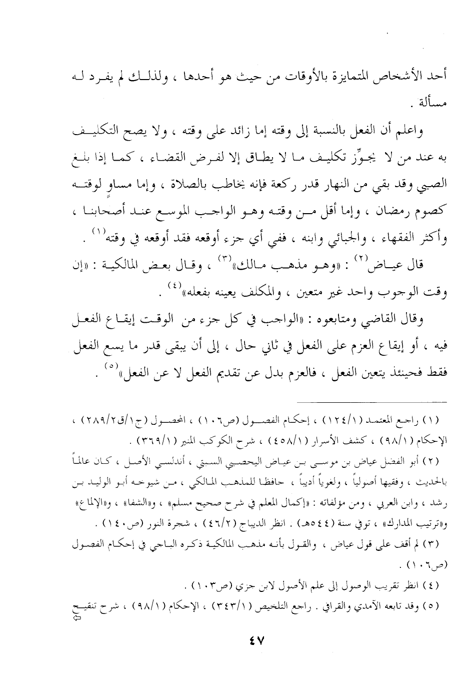 قال عياض: «وهو مذهب مالك» , وقال بعض المالكية: «إن وقت الوجوب واحد غير متعين, والمكلف يعينه بفعله».