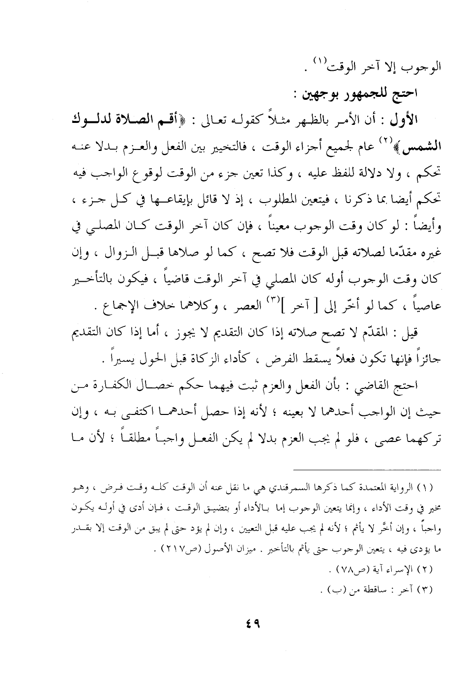 الأول: أن الأمر بالظهر مثلًا كقوله تعالى: {أقم الصلاة لدلوك الشمس} عام لجميع أجزاء الوقت, فالتخيير بين الفعل والعزم بدلا عنه تحكم, ولا دلالة للفظ عليه, وكذا تعين جزء من الوقت لوقوع الواجب فيه تحكم أيضا بما ذكرنا, فيتعين المطلوب, إذ لا قائل بإيقاعها في كل جزء, وأيضًا: لو كان وقت الوجوب معينًا, فإن كان آخر الوقت كان المصلي في غيره مقدّما لصلاته قبل الوقت فلا تصح, كما لو صلاها قبل الزوال, وإن كان وقت الوجوب أوله كان المصلي في آخر الوقت قاضايًا, فيكون بالتأخير عاصيًا, كما لو أخّر إلى [آخر] العصر, وكلاهما خلاف الإجماع.