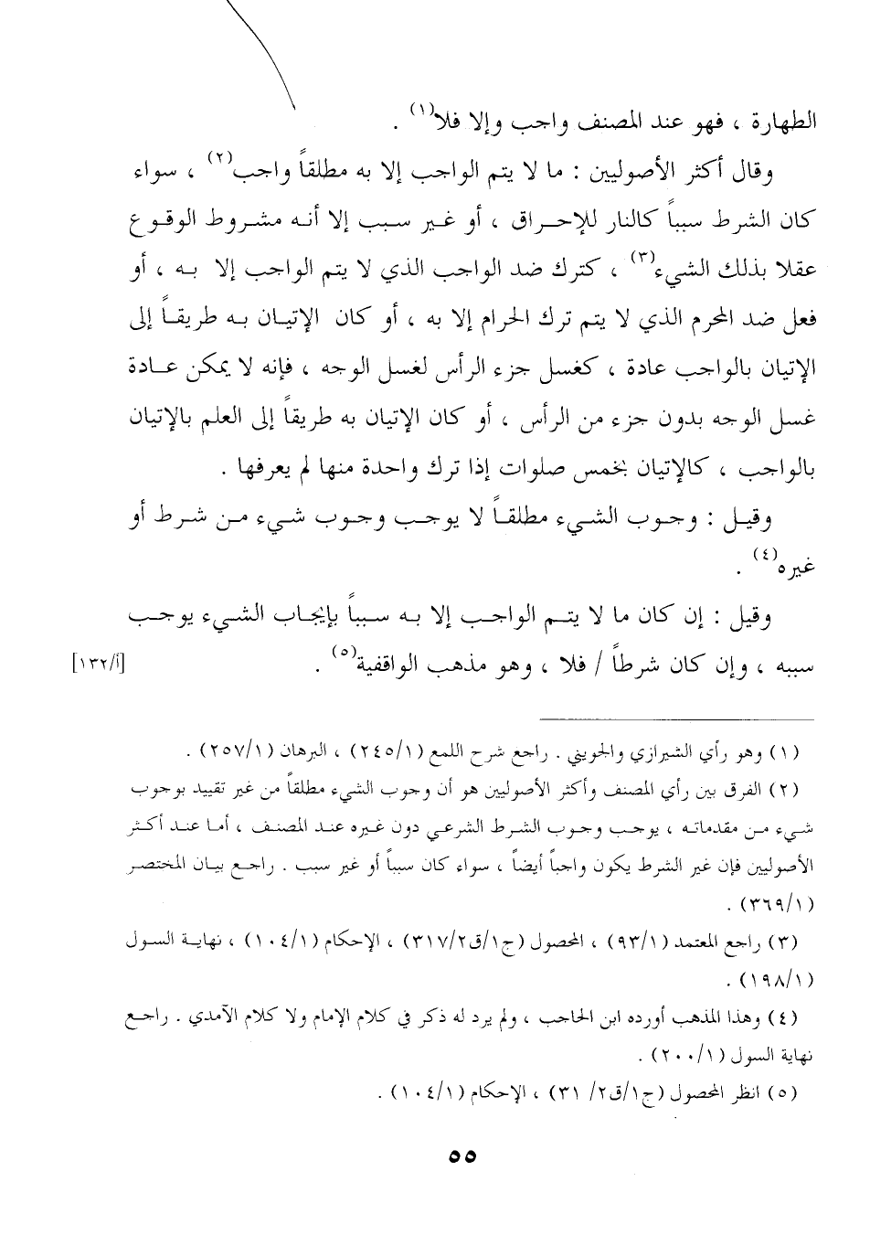 وقال أكثر الأصوليين: ما لا يتم الواجب إلا به مطلقًا واجب, سواء كان الشرط سببًا كالنار للإحراق, أو غير سبب إلا أنه مشروط الوقوع عقلا بذلك الشيء, كترك ضد الواجب الذي لا يتم الواجب إلا به, أو فعل ضد المحرم الذي لا يتم ترك الحرام إلا به, أو كان الإتيان به طريقًا إلى الإتيان بالواجب عادة, كغسل جزء الرأس لغسل الوجه, فإنه لا يمكن عادة غسل الوجه بدون جزء من الرأس, أو كان الإتيان به طريقًا إلى العلم بالإتيان بالواجب, كالإتيان بخمس صلوات إذا ترك واحدة منها لم يعرفها.