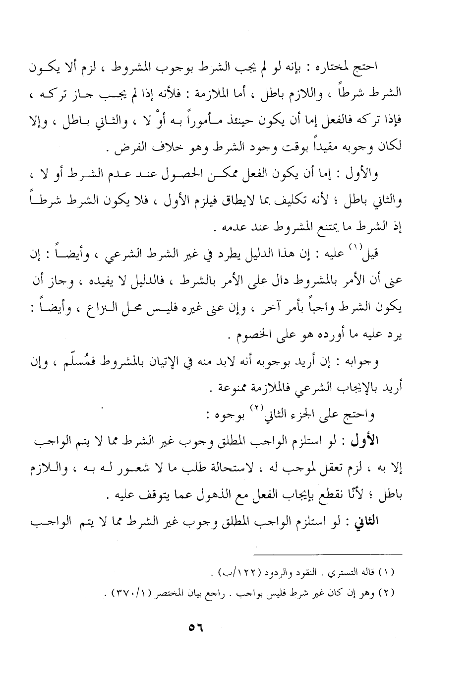 والأول: إما أن يكون الفعل ممكن الحصول عند عدم الشرط أو لا, والثاني باطل؛ لأنه تكليف بما لا يطاق فيلزم الأول, فلا يكون الشرط شرطًا إذ الشرط ما يمتنع المشروط عند عدمه.