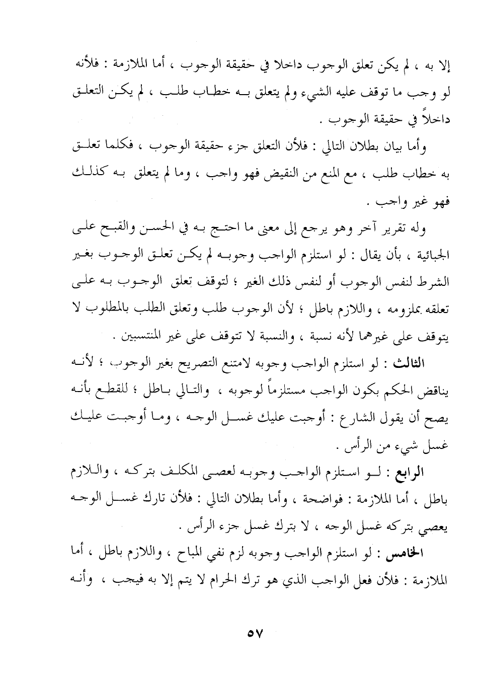 وله تقرير آخر وهو يرجع إلى معنى ما احتج به في الحسن والقبح على الجبائية, بأن يقال: استلزم الواجب وجوبه لم يكن تعلق الوجوب بغير الشرط لنفس الوجوب أو لنفس ذلك الغير؛ لتوقف تعلق الوجوب به على تعلقه بملزومه, واللازم باطل؛ لأن الوجوب طلب وتعلق الطلب بالمطلوب لا يتوقف على غيرهما لأنه نسبة, والنسبة لا تتوقف على غير المنتسبين.
