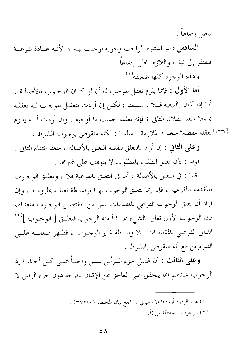 أما الأول: فإنما يلزم تعقل الموجب له أن لو كان الوجوب بالأصالة, أما إذا كان بالتبعية فلا. سلمنا: لكن إن أردت بتعقل الموجب له تعقله مجملا منعنا بطلان التالي؛ فإنه يعلمه حسب ما أوجبه, وإن أردت أنه يلزم تعقله مفصلا / الملازمة. سلمنا: لكنه منقوض بوجوب الشرط.