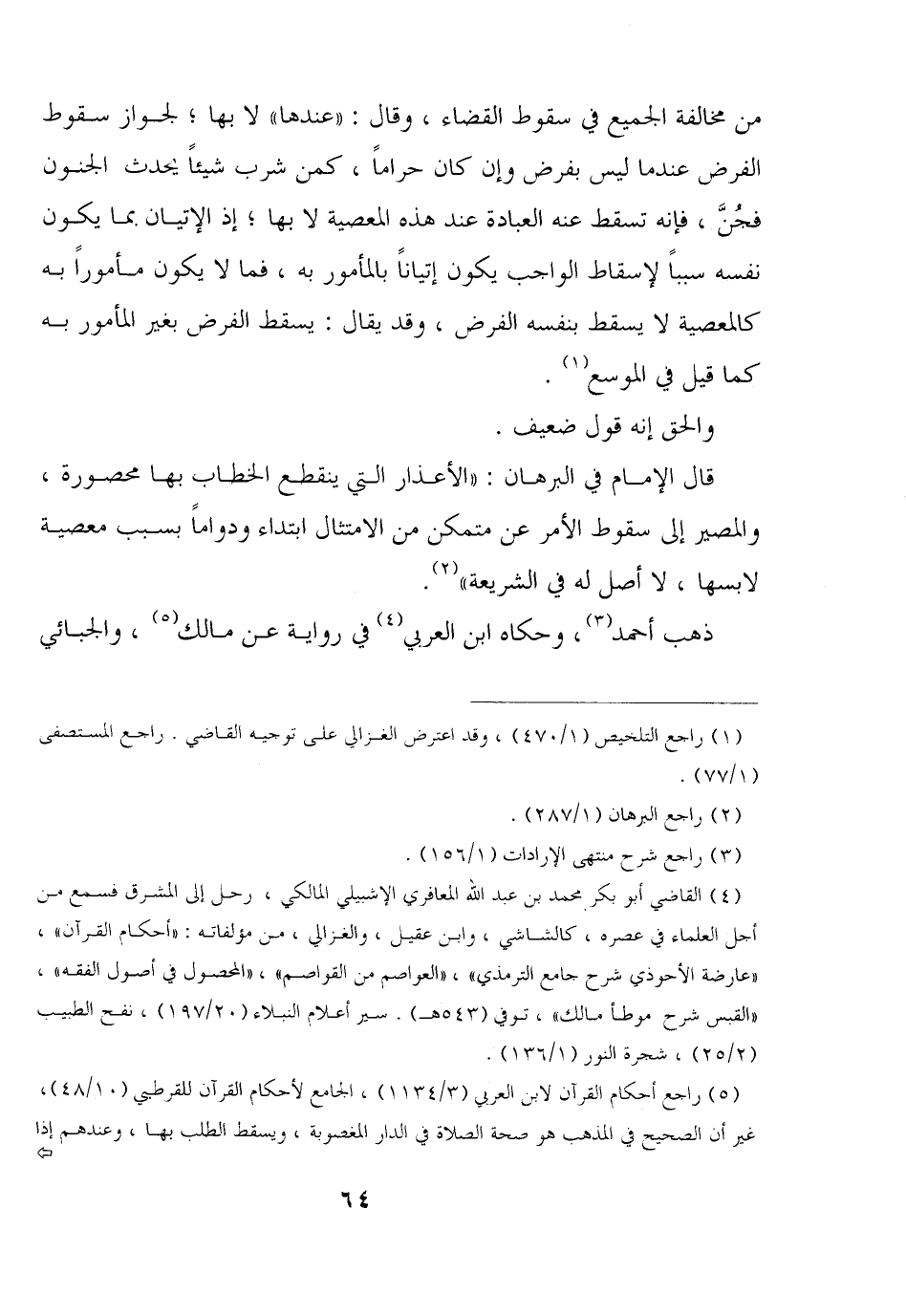 من مخالفة الجميع في سقوط القضاء, وقال: «عندها» لا بها؛ لجواز سقوط الفرض عندما ليس بفرض وإن كان حرامًا, كن شرب شيئًا يحدث الجنون فجُنَّ, فإنه تسقط عنه العبادة عند هذه المعصية لا بها؛ إذ الإتيان بما يكون نفسه سببًا لإسقاط الواجب يكون إتيانًا بالمأمور به, فما لا يكون مأمورًا به كالمعصية لا يسقط بنفسه الفرض, وقد يقال: يسقط الفرض بغير المأمور به كما قيل في الموسع.