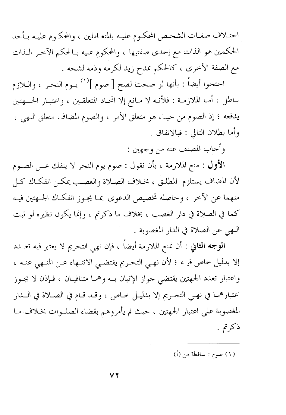 الأول: منع الملازمة, بأن نقول: صوم يوم النحر لا ينفك عن الصوم لأن المضاف يستلزم المطلق, بخلاف الصلاة والغصب يمكن انفكاك كل منهما عن الآخر, وحاصلة تخصيص الدعوى بما يجوز انفكاك الجهتين فيه كما في الصلاة في دار الغصب, بخلاف ما ذكرتم, وإنما يكون نظيره لو ثبت النهي عن الصلاة في الدار المغصوبة.