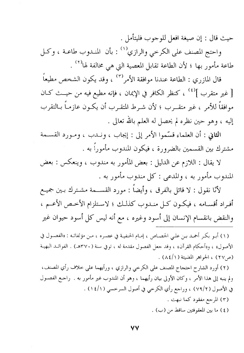 واحتج المصنف على الكرخي والرازي: بأن المندوب طاعة, وكل طاعة مأمور بها؛ لأن الطاعة تقابل المعصية التي هي مخالفة لها.