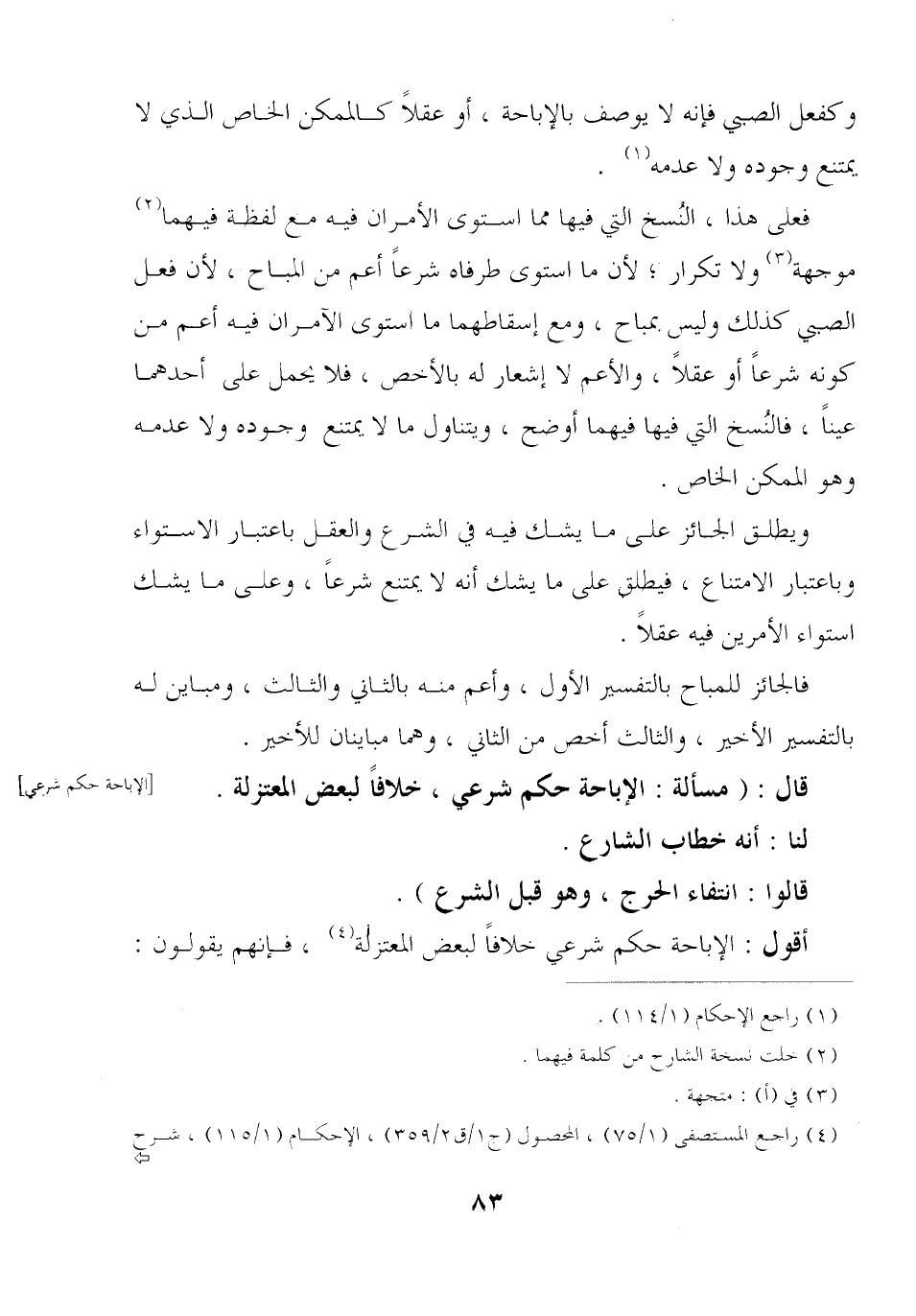 فعلى هذا, النُسخ التي فيها مما استوى الأمران فيه مع لفظة فيهما موجهة ولا تكرار؛ لأن ما استوى طرفاه شرعًا أعم من المباح, لأن فعل الصبي كذلك وليس بمباح, ومع إسقاطهما ما استوى الآمران فيه أعم من كونه شرعًا أو عقلًا, والأعم لا إشعار له بالأخص, فلا يحمل على أحدهما عينًا, فالنُسخ التي فيها فيهما أوضح, ويتناول ما لا يمتنع وجوده ولا عدمه وهو الممكن الخاص.