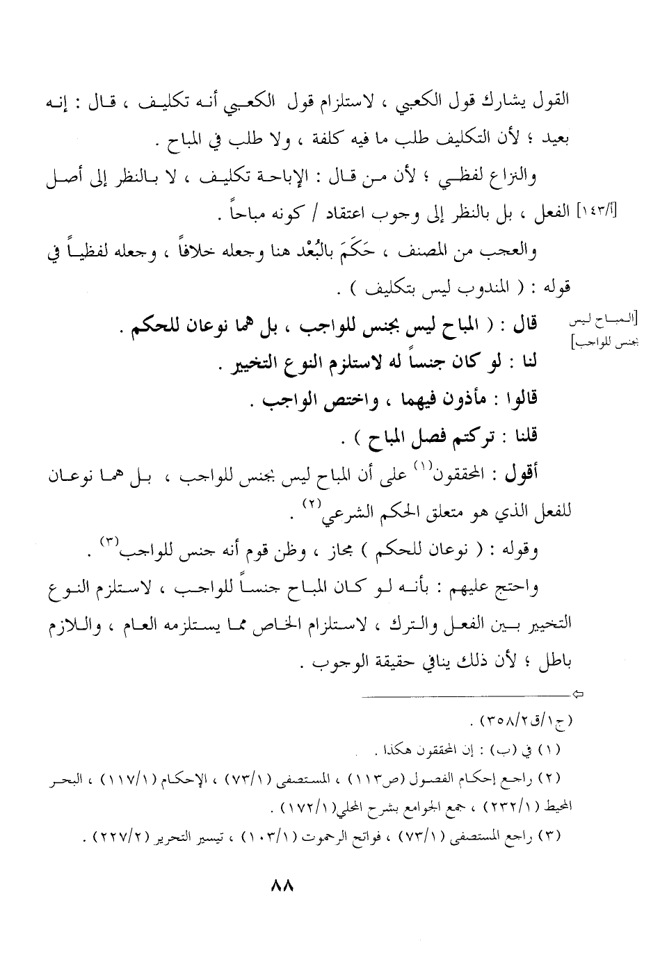واحتج عليهم: بأنه لو كان المباح جنسًا للواجب, لاستلزام النوع التخيير بين الفعل والترك, لاستلزام الخاص مما يستلزمه العام, واللازم باطل؛ لأن ذلك ينافي حقيقة الوجوب.