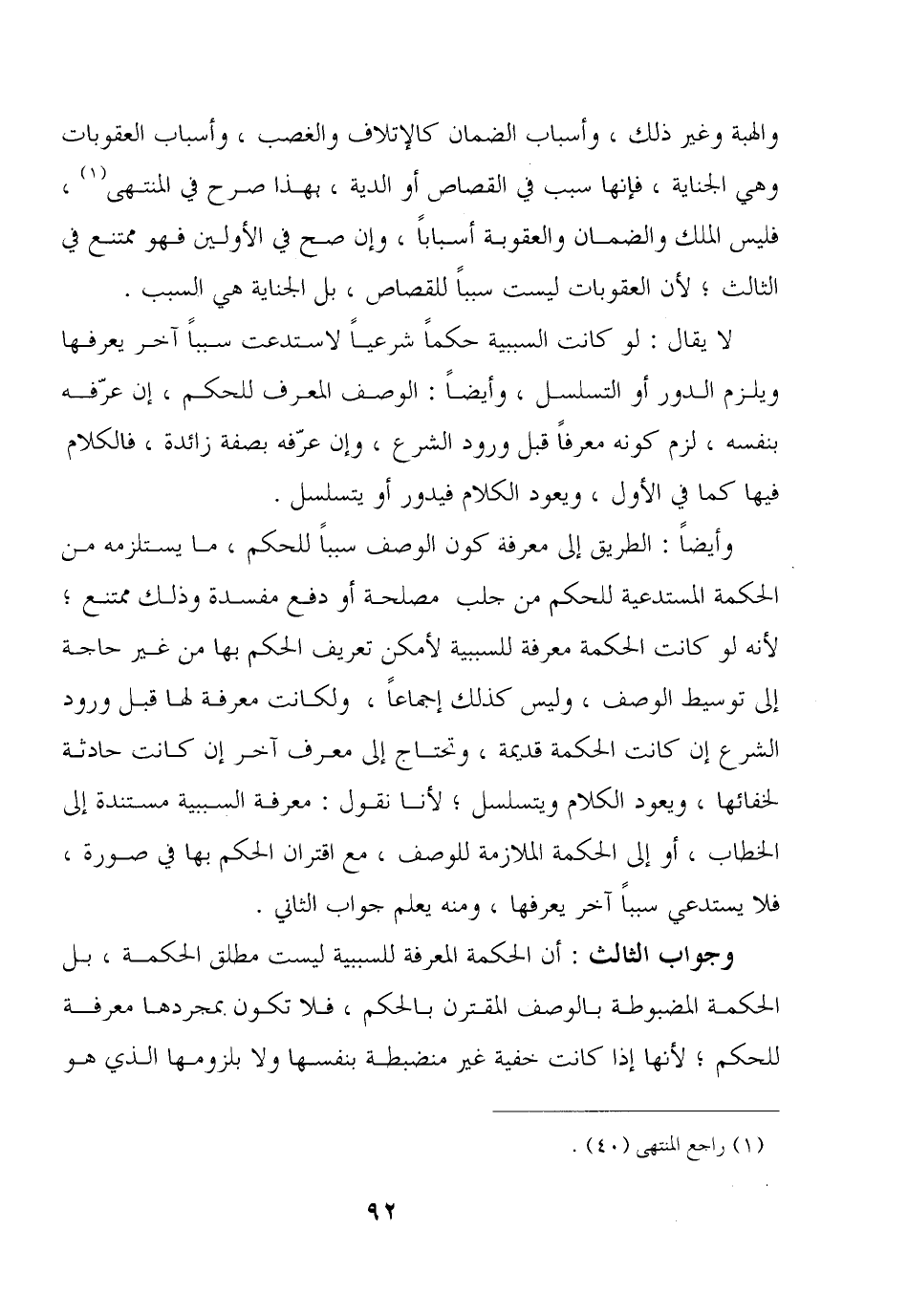 وأيضًا: الطريق إلى معرفة كون الوصف سببًا للحكم, ما يستلزمه من الحكمة المستدعية للحكم من جلب مصلحة أو دفع مفسدة وذلك ممتنع؛ لأنه لو كانت الحكمة معرفة للسببية لأمكن تعريف الحكم بها من غير حاجة إلى توسيط الوصف, وليس كذلك إجماعًا, ولكانت معرفة لها قبل ورود الشرع إن كانت الحكمة قديمة, وتحتاج إلى معرف آخر إن كانت حادثة لخفائها, ويعود الكلام ويتسلسل؛ لأنا نقول: معرفة السببية مستندة إلى الخطاب, أو إلى الحكمة الملازمة للوصف, مع اقتران الحكم بها في صورة, فلا يستدعي سببًا آخر يعرفها, ومنه يعلم جواب الثاني.