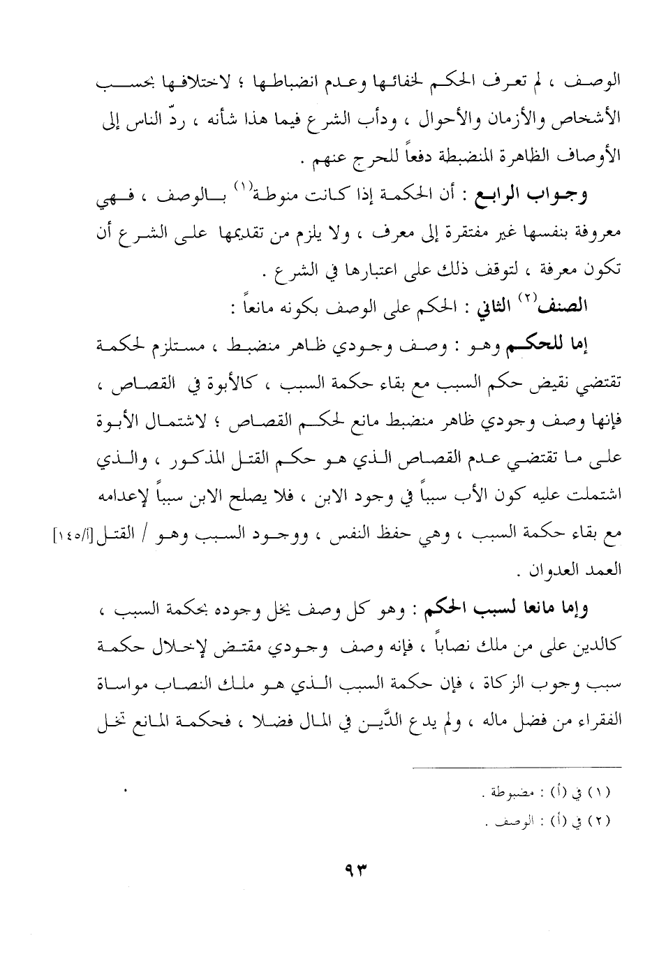 إما للحكم وهو: وصف وجودي ظاهر منضبط, مستلزم لحكمة تقتضي نقيض حكم السبب مع بقاء حكمة السبب, كالأبوة في القصاص, فإنها وصف وجودي ظاهر منضبط مانع لحكم القصاص؛ لاشتمال الأبوة على ما تقتضي عدم القصاص الذي هو حكم القتل المذكور, والذي اشتملت عليه كون الأب سببًا في وجود الابن, فلا يصلح الابن سببًا لإعدامه مع بقاء حكمة السبب, وهي حفظ النفس, ووجود السبب وهو / القتل العمد العدوان.