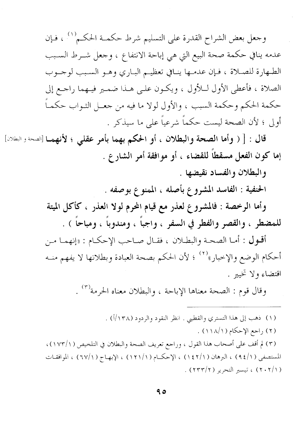 وجعل بعض الشراح القدرة على التسليم شرط حكمة الحكم, فإن عدمه ينافي حكمة صحة البيع التي هي إباحة الانتفاع, وجعل شرط السبب الطهارة للصلاة, فإن عدمها ينافي تعظيم الباري وهو السبب لوجوب الصلاة, فأعطى الأول للأول, ويكون على هذا ضمير فيهما راجع إلى حكمة الحكم وحكمة السبب, والأول لولا ما فيه من جعل الثواب حكمًا أولى؛ لأن الصحة ليست حكمًا شرعيًا على ما سيذكر.