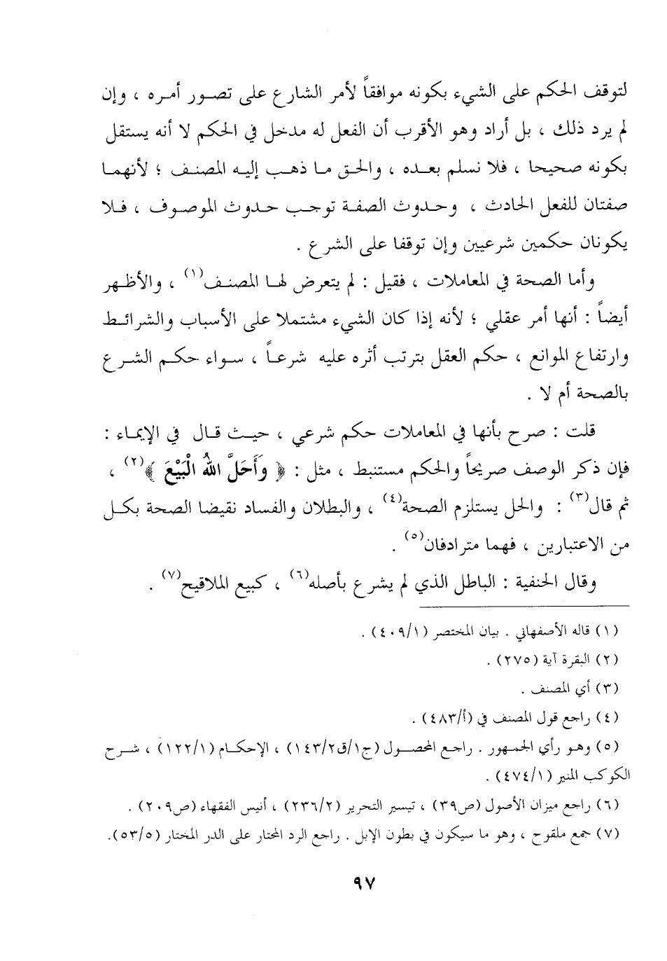 قلت: صرح بأنها في المعاملات حكم شرعي, حيث قال في الإيماء: فإن ذكر الوصف صريحًا والحكم مستنبط, مثل: {وأحل الله البيع} , ثم قال: والحل يستلزم الصحة, والبطلان والفساد نقيضا الصحة بكل من الاعتبارين, فهما مترادفان.