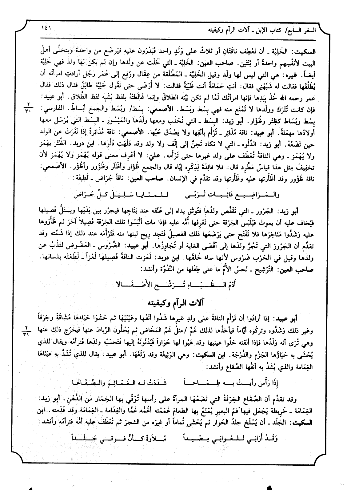3 - أَبُو عبيد إِذا أرادُوا أَن تَرْأَم الناقةُ على ولدِ غيرِها شَدُّوا أنَْْفَها وعَيْنَنْيَها ثمَّ حَشَوْا حيَاءَهَا مُشَاقَةٌ وخِرَقاً وَغير ذَلِك وَشَدُّوه وتركُوه أيَّاماً فيأخذُها لذَلِك غَمِّ مثلُ غَمِّ المَخَاض ثمَّ يَحُلُّون الرِّباط عَنْهَا فيخرُج ذَلِك عَنْهَا وَهِي تُرَى أَنه وَلَدُها فَإِذا ألقته حَلّوا عينيها وَقد هَيَّوا لَهَا حُوَاراً فيَدْنُونَهُ إِلَيْهَا فَتَحسَبُه ولدَها فترأمُه وَيُقَال للَّذي يُخْشَى بِهِ حَيَاؤُها الجَزْم والدُّرْجَة ابْن السّكيت وَهِي الوَثِيغَة وَقد وَثَغَهَا أَبُو عبيد يُقَال للَّذي تُشَدُّ بِهِ عيْنَاهَا الغِمَامة وَالَّذِي يُشَدُّ بِهِ أنفُها الصِّفاع وَأنْشد