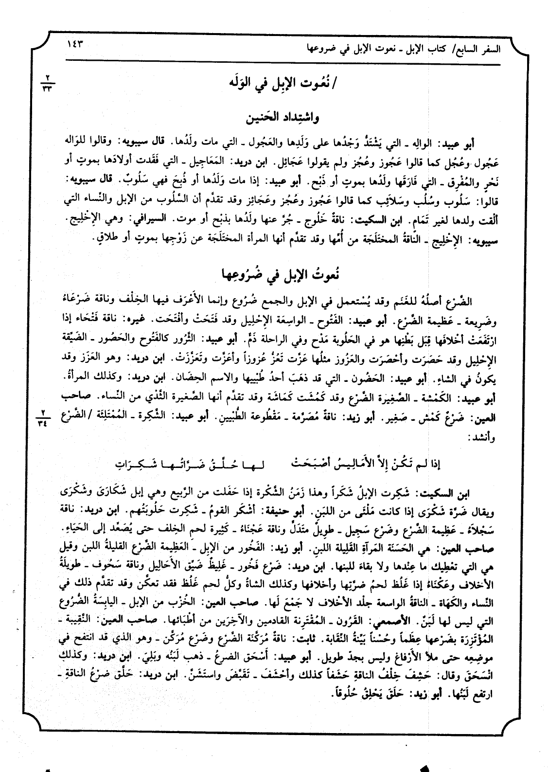3 - الضَّرْع أصلُهُ للغَنَم وَقد يُسْتعمل فِي الْإِبِل وَالْجمع ضُرُوع وَإِنَّمَا الأَعْرَف فِيهَا الخِلْف وناقة ضَرْعَاء وضَرِيعة عَظيمة الضَّرْع أَبُو عبيد الفَتُوح الواسِعَة الإِحْليِل وَقد فَتَحَتْ وأفْتَحَت غَيره نَاقَة فَتْحَاء إِذا ارْتَفَعتْ أخْلافَها قِبَلَ بَطْنِها هُوَ فِي الحَلُوبة مَدْح وَفِي الرَّاحِلَة ذمٌّ أَبُو عبيد الثَّرُور كالفَتُوح والحَصُور الضَيِّقَة الإِحْليِل وَقد حَصَرَت وأحْصَرَت والعَزُوز مثلُها عَزَّت تُعُزُّ عُزوزاً وأعَزَّت وتَعَزَّزَتْ ابْن دُرَيْد وَهُوَ العَزَز وَقد يكون فِي الشاءِ أبوعبيد الحَضُون الَّتِي قد ذهَبَ أحدُ طُبْييها وَالِاسْم الحِضَان ابْن دُرَيْد وَكَذَلِكَ الْمَرْأَة ُأبو عبيد الكَمْشة الصَّغِيرة الضَّرْع وَقد كَمُشَت كَمَاشَة وَقد تقدَّم أَنَّهَا الصَّغيرة الثَّدْي من النِّساء صَاحب الْعين ضَرْعٌ كَمُش صَغِير أَبُو زيد ناقةٌ مُصَرَّمة مَقْطُوعة الطُبْيينِ أَبُو عبيد الشَّكِرة المُمْتَلِئَة الضَّرْع وَأنْشد