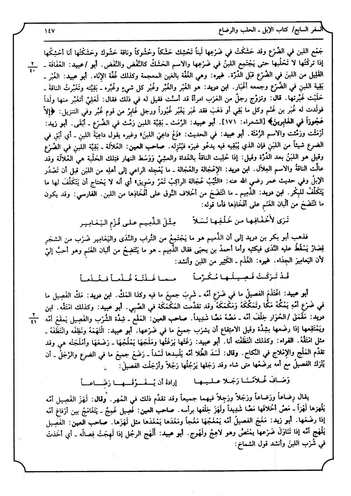 _ يُقَال رِضاعاً ورَضاعاً ورَجَلا ورَجِلاَ فيهمَا جَمِيعًا وَقد تقدَّم ذَلِك فِي المُهر وَقَالَ لَهَزَ الفَصِيل أمَّه يَلْهزها لَهْزًا مَصَّ أخْلافَها مَصًّا شَدِيدًا ولَهَزَ خِلْفها بِرَأْسِهِ صَاحب الْعين فَصِيل غَمِجٌ يَتَغَامَجُ بَين أرْفَاغِ أمِّه إِذا رضَعَها أَبُو زيد مَغَجَ الفصيلُ أمَّه يَمْغَجُهَا مَغْجاً ومَغَدَها يَمْغَدَها مثل لَهَزَها صَاحب الْعين الفَصِيل يَلْهَج أمَّه إِذا تَنَاوَلَ ضَرْعها يَمْتَصُّ وَهُوَ لاهِجٌ ولَهُوج أَبُو عبيد ألْهَج الرجُل إِذا لَهِجَتْ فِصالُه أَي أخذَتْ فِي شُرْب اللبنَ وَأنْشد قَول الشماخ