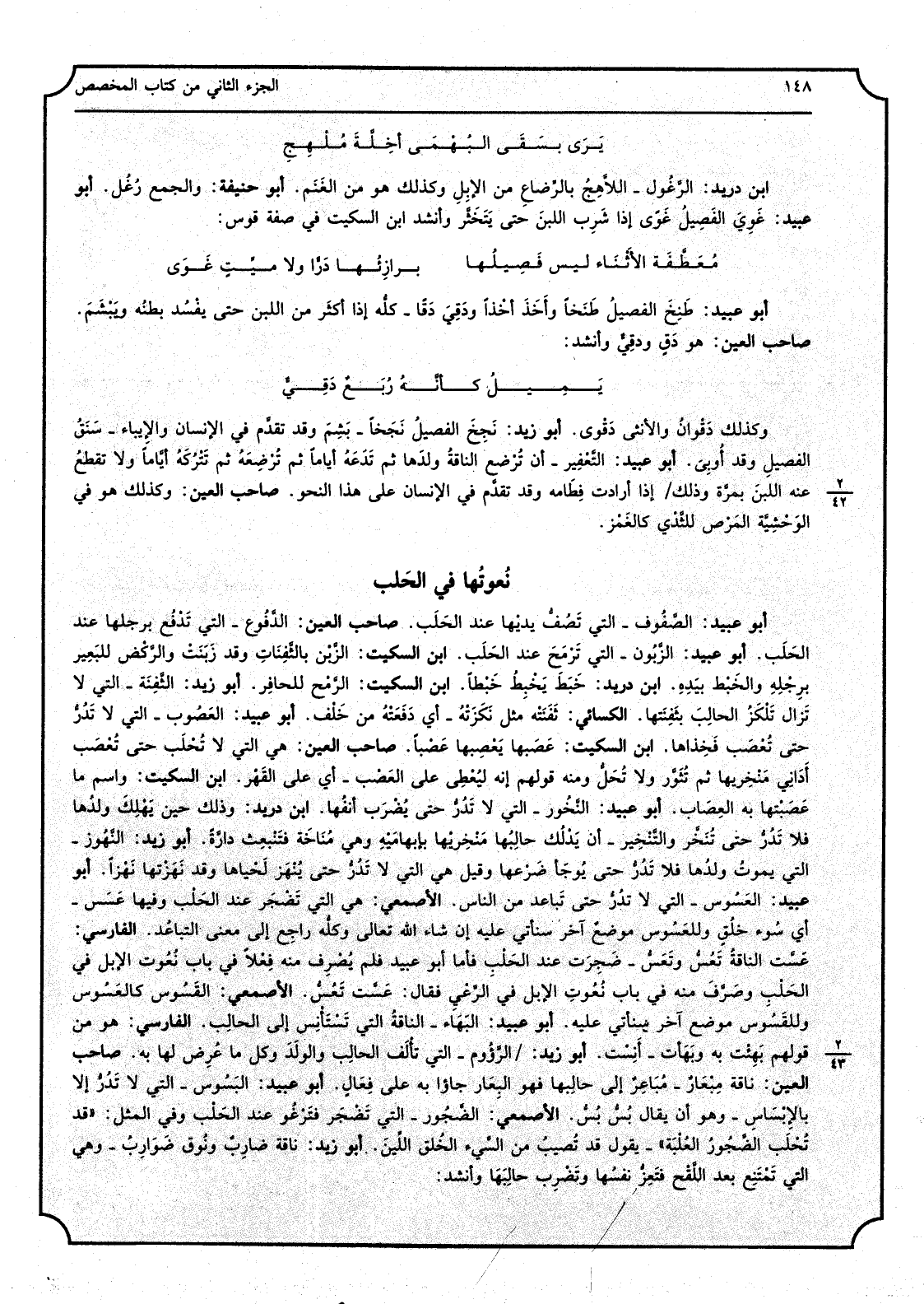 3 - أَبُو عبيد الصَّفُوف الَّتِي تَصُفُّ يديْها عِنْد الحَلَب صَاحب الْعين الدَّفُوع الَّتِي تَدْفُع برجلها عِنْد الحَلَب أَبُو عبيد الزَّبُون الَّتِي تَرْمَحَ عِنْد الحَلَب ابْن السّكيت الزَّبْن بالثفنَِاتِ وَقد زَبَنَتْ والرَّكْض للبعَير برِجْلِهِ والخَبْط بيَدِهِ ابْن دُرَيْد خَبَطَ يَخْبِطْ خَبْطاً ابْن السّكيت الرَّمْح للحافِر أَبُو زيد الثفِنَة الَّتِي لَا تَزال تَلْكَزُ الحالِبَ بثَفِنَتها الْكسَائي ثَقَنَتْه مثل نَكَزَتْهُ أَي دَفَعَتْهُ من خَلْف أَبُو عبيد العَصُوب الَّتِي لَا تَدُرُّ حَتَّى تُعْصَب فَخِذاها ابْن السّكيت عَصَبها يَعْصِبها عَصْباً صَاحب الْعين هِيَ الَّتِي لَا تُحْلَب حَتَّى تُعْصَب أدَاني مَنْخِريها ثمَّ تُثَوَّر وَلَا تُحَلُّ وَمِنْه قَوْلهم إِنَّه ليُعْطِى على العَصْب أَي على القَهْر ابْن السّكيت وَاسم مَا عَصَبْتها بِهِ العِصَاب أَبُو عبيد النَّخُور الَّتِي لَا تَدُرُّ حَتَّى يُضْرَب أنفُها ابْن دُرَيْد وَذَلِكَ حِين يَهْلِكَ ولدُها فَلَا تَدُرُّ حَتَّى تُنَخَّر والتَّنْخِير أَن يَدْلُك حالِبُها مَنْخِرْيها بإبهامَيْهِ وَهِي مُنَاخَة فتَنْبعِث دارَّة أَبُو زيد النَّهُوز الَّتِي يموتُ ولدُها فَلَا تَدُرُّ حَتَّى يوْجَأ ضَرْعها وَقيل هِيَ الَّتِي لَا تَدُرُّ حَتَّى يُنْهَز لَحْياها وَقد نَهَزْتها نَهْزاً أَبُو عبيد العَسُوس الَّتِي لَا تَدُرُّ حَتَّى تَباعد من النَّاس الْأَصْمَعِي هِيَ الَّتِي تَضْجَر عِنْد الحَلْب وفيهَا عسَسَ أَي سُوء خلُقٍ وللعَسُوس موضعٌ آخر سنأتي عَلَيْهِ إِن شَاءَ الله تَعَالَى وكلَّه راجِع إِلَى معنى التباعُد الْفَارِسِي عَسَّت الناقةُ تَعُسُّ وتَعَسُّ ضَجِرَت عِنْد الحَلْب فَأَما أَبُو عبيد فَلم يُصْرِف مِنْهُ فِعْلاً فِي بَاب نُعُوت الإِبل فِي الحَلْبِ وصَرَّفَ مِنْهُ فِي بَاب نُعُوتِ الْإِبِل فِي الرِّعْي فَقَالَ عَسَّت نَعُسُّ الْأَصْمَعِي القَسُوس كالعَسُوس وللقَسُوس مَوضِع آخر سنأتي عَلَيْهِ أبوعبيد البَهَاء الناقةُ الَّتِي تَسَْْتْأنِس إِلَى الحالِب الْفَارِسِي هُوَ من قَوْلهم بَهِئْت بِهِ وبَهَأت أنِْسْت أَبُو زيد الرَّؤُوم الَّتِي تأْلَف الحالِب والولَدَ وكل مَا عُرِض لَهَا بِهِ صَاحب الْعين نَاقَة مِبْعَارٌ مُبَاعِرٌ إِلَى حالِبها فَهُوَ البِعَار جاؤا بِهِ على فِعَالٍ أبوعبيد البَسُوس الَّتِي لَا تَدُرُّ إِلَّا بالإبْسَاسِ وَهُوَ أَن يُقَال بُسٌّ بُسٌّ الْأَصْمَعِي الضَّجُور الَّتِي تَضْجَر فتَرْغُو عِنْد الحَلْب وَفِي الْمثل // (قد تُحْلَب الضَّجُورُ العُلْبَة) // يَقُول قد تُصيبُ من السَّيء الخُلق اللَّينَ أَبُو زيد نَاقَة ضارِبٌ ونُوق ضَوَارِبُ وَهِي الَّتِي تًمْنتَنِع بعد اللَّقْح فتَعِزُّ نفسُها وتَضْرِب حالِبَها وَأنْشد