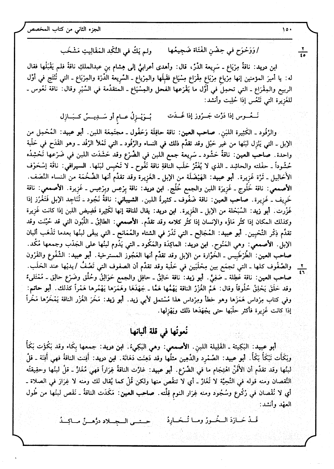 _ والرفود الْكَثِيرَة اللبنِ صَاحب الْعين نَاقَة حافلة وحفول مجتمعة اللَّبن أَبُو عبيد المخْمِل من الْإِبِل الَّتِي ينزل لَبنهَا من غير حبْل وقدتقدَّم ذَلِك فِي النِّسَاء والرُّفود الَّتِي تملأ الرفد وَهُوَ الْقدح فِي حلْبة وَاحِدَة صَاحب الْعين ناقةٌ حشُود سريعة جمع اللَّبن فِي الضَّرع وَقد حشدت اللَّبن فِي ضرْعها تحشِدُه حشُوداً حفلته والحاشد الَّذِي لَا يفتر حلب الناقةِ نَاقَة نفوح لَا تحبس لبنَها السيرافي نَاقَة إسْحوْف الأحاليل ثرة غزيرة أَبُو عُبَيْدَة الهيضلة من الْإِبِل الغزيرة وَقد تقدَّم أَنَّهَا الضخمة من النِّسَاء النّصْف الْأَصْمَعِي نَاقَة خلوُج غزيرة اللَّبن وَالْجمع خُلْج ابْن دُرَيْد نَاقَة برعس غزيرة الْأَصْمَعِي نَاقَة خريف غزيرة صَاحب الْعين نَاقَة ضفوف كثيرةُ اللَّبن الشَّيْبَانِيّ ناقةٌ نجُود تُناجد الْإِبِل فتغرز إِذا غزُرت أَبُو زيد السِّبَحْلة من الْإِبِل الغزيرة ابْن دُرَيْد ياق للناقة إِنَّهَا لكثيرة فضيض اللَّبن إِذا كَانَت غزيرة وَكَذَلِكَ الْمَكَان إِذا كثر مَاؤُهُ وَالْإِنْسَان إِذا كثر كَلَامه وَقد تقدَّم الْأَصْمَعِي الطالِقُ اللَّبُون الَّتِي قد حيَّنَت وَقد تقدَّم ذِكْر التحْيين أبوعبيد المُحالِج الَّتِي تدُرّ فِي الشتَاء والمُمانح الَّتِي يبْقى لبنُها بَعْدَمَا تَذْهب ألبان الْإِبِل الْأَصْمَعِي وَهِي المنوح ابْن دُرَيْد الماكِدَة والمَكُود الَّتِي يدُوم لبنُها على الجدب وَجَمعهَا مُكُد صَاحب الْعين الطرطبيس الخوَّارة من الْإِبِل وَقد تقدَّم أَنَّهَا العجُوز المسترخية أَبُو عبيد الشفُوع والقرْون والصفوف كلهَا الَّتِي تجمع بَين مخلبين فِي حلبة وَقد تقدَّم أَن الصُّفُوف الَّتِي تصفُّ يديْها عِنْد الْحَلب صَاحب الْعين نَاقَة عطِلة صفيٌّ أَبُو زيد حالِقٌ حافِل وَالْجمع حوَالِق وحُلَّق وضرْع حالِق مُمْتلىءُ وَقد حلق يحْلق حٌلُوقا وَقَالَ همَّ الغُزُرُ النَّاقة يهمُّها همًّا جهدها وهَمَزَها همْزاً كَذَلِك أَبُو حَاتِم وَفِي كتاب مرْداس همزها وَهُوَ خطأ ومِرْداس هَذَا مُسْتعمل لأبي زيد أَبُو زيد مخرَ الغُزْر النَّاقة يمخرها مخراً إِذا كَانَت غزيرة فَأكْثر حلْبها حَتَّى يجهدها ذَلِك ويهزلها