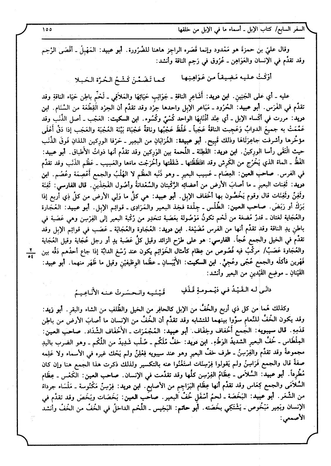 _ عَلَيْهِ أَي على الجَنِينِ ابْن دُرَيْد: أَشَاعِرِ الناقةِ جَوَانِبِ حَيَائِهَا والمَلاَقِي لَحْم باطِن حَيَاء الناقةِ وَقد تقدَّم فِي الْفرس أَبُو عبيد: الحرُُود مَبَاعر الابِل وَاحِدهَا حِرْد وَقد تقدَّم أَن الحِرْد القِطْعَة من السَّنَام ابْن دُرَيْد: مَرَرْت فِي أكْساء الابل أَي عِنْدَ أذْنَابِهَا الْوَاحِد كُسْيٌّ وكُسُوء ابْن السّكيت: العَجْب أصل الذَّنَب وَقد عَمَّمَتْ بِهِ جميعَ الدوابِّ وَعَجِبت الناقةُ عَجَبًا غَلُظَ عَجْبهُا وناقةٌ عَجْبَاءُ بَيِّنَة العُجْبَة والعَجَب إِذا دَقَّ أَعْلَى مؤخَّرها وأشرفت جاعِرَتَهَا وَذَلِكَ قَبِيح أَبُو عُبَيْدَة الغُرَابَانِ من البعيِر حَرْفا الوِركين اللذانِ فَوقَ الذَّنَب حَيْثُ التقَىَ رَأْسا الوِركيْن ابْن دُرَيْد القَطِنَة اللَّحمة بَين الوَرِكين وَقد تقدَّم أَنَّهَا ذواتُ الأطباق أَبُو عبيد الفَظُّ الماءُ الَّذِي يَخْرُج من الكَرِش وَقد افتَظَظْتها شَقَقْتها وأخْرَجْت ماءَها والعَسِيب عَظْم الذَنَب وَقد تقدَّم فِي الْفرس صَاحب الْعين العِصَام عَسِيب البعيِر وَهُوَ ذَنَبه العظْم لَا الَهْلبُ وَالْجمع أَعْصِمَة وعُصُم ابْن دُرَيْد ثَفِنَات البعيرِ مَا أصابَ الأَرْض من أعضائِه الرُّكْبتان والسَّعْدانةُ وأصُول الفَخِذيَنِ قَالَ الْفَارِسِي ثَفِنَة وثَفِنٌ وثَفِنَات قَالَ وَقوم يَخُصَّونَ بهَا أخْفاف الإبِل أَبُو عبيد هِيَ كلُّ مَا وَلِي الأَرْض من كلِّ ذِي أَربع إِذا بَرَك أَو رَبَضَ صَاحب الْعين الطِّلْس جِلْدة فخِذ الْبَعِير والمَرَادِى قوائِم الْإِبِل أَبُو عبيد العُجَارة والعُجَاية لُغَتَانِ قدرُ مُضغة من لَحْم تكونُ مَوْصُولة بعَصَبة تنحدِر من رُكْبة الْبَعِير إِلَى الفِرْسِن وَهِي عَصَبة فِي باطنِ يَد النَّاقة وَقد تقدَّم أَنَّهَا من الْفرس مُضَيْغة ابْن دُرَيْد العُجَاوة والعُجَايَة عَصَب فِي قوائِم الْإِبِل وَقد تقدَّم فِي الْخَيل وَالْجمع عُجًا الْفَارِسِي هُوَ على طرْح الزَّائِد وَقيل كلُّ عَصَبة يدِ أَو رجل عُجَاية وَقيل العُجَاية والعُجَاوة عَصَبٌ مُركَّبُ فِيهِ فُصُوص من عِظام كامثال الخَوَاِتم يكون عِنْد رُسْغ الدابَّة إِذا جَاع أحدُهم دَقَّة بَين فَهْرين فأكلَه وَالْجمع عُجّى وعُجِيٌّ ابْن السّكيت الأيْبَسانِ عظْما الوِظيفيْنِ وَقيل مَا ظَهَر مِنْهُمَا أَبُو عبيد القَيْنانِ موضِع القَيْدينِ من الْبَعِير وانشد: