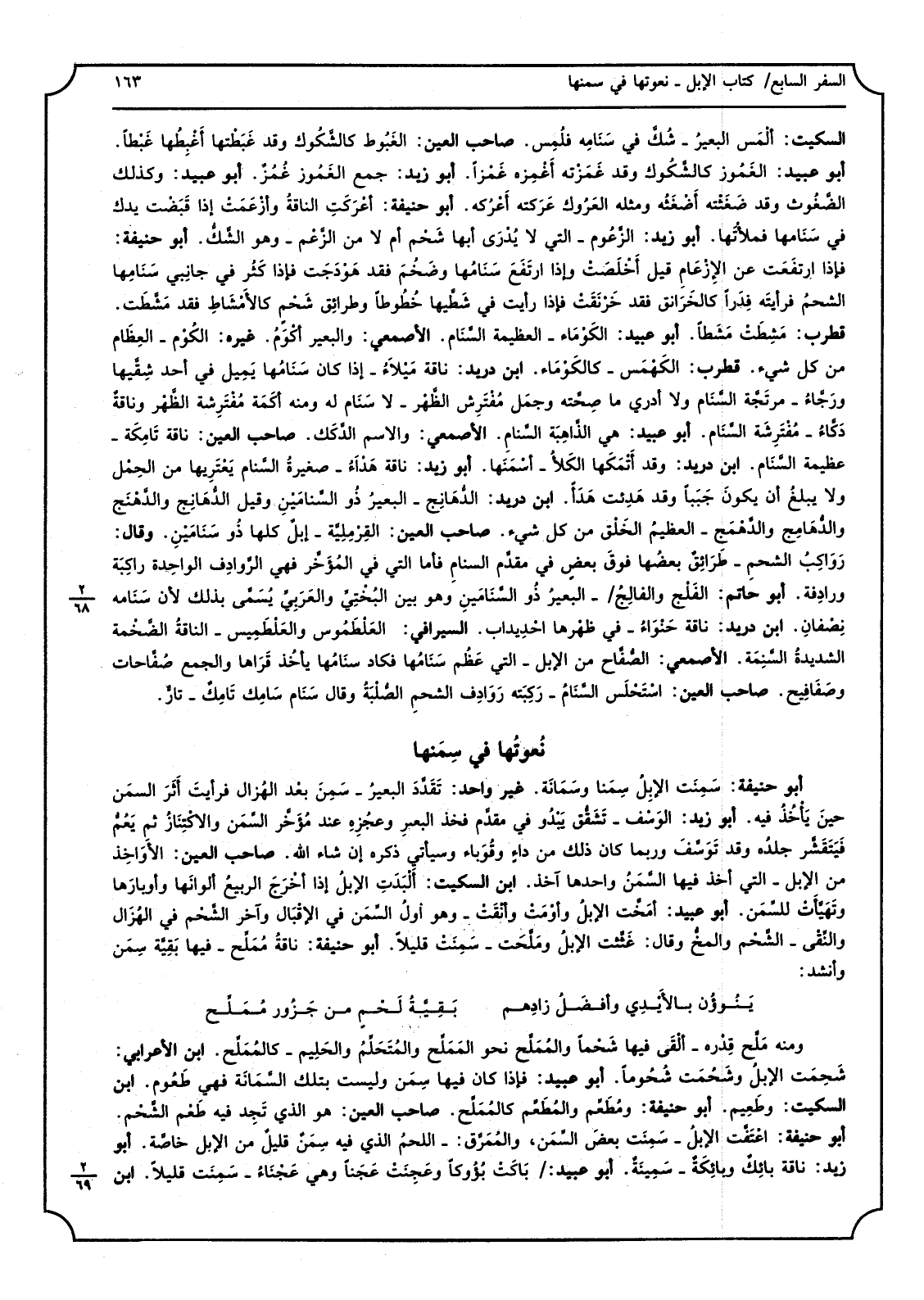 3 - أَبُو حنينفة سَمِنَت الإبِلُ سِمَنا وسَمَانَة غير وَاحِد تَقَدَّدَ البعيُر َسِمَن بعْد الهُزال فرأيتَ أثَرَ السمَن حِين يَأْخُذُ فِيهِ أَبُو زيد الوَسْف تَشَقُّق يَبْدُو فِي مقدَّم فَخذ البعرِ وعجُزِهِ عِنْد مُؤَخَّر السَّمَن والاكْتِنَازُ ثمَّ يَعُمُّ فَيَتَقَشَّر جلدُه وَقد تَوَسَّفَ وَرُبمَا كَانَ ذَلِك من داءٍ وقُوَباء وَسَيَأْتِي ذكره إِن شَاءَ الله صَاحب الْعين الأَوَاخِذ من الْإِبِل الَّتِي أَخذ فِيهَا السَّمَنُ وَاحِدهَا آخذ ابْن السّكيت ألْبَدَتَ الْإِبِل إِذا أخْرَجَ الربيعُ ألوانَها وأوبارَها وتَهَيَّأَتْ للسَّمَن أَبُو عبيد أمَخَّت الإبلُ وأوْمَتْ وأنْقَتْ وَهُوَ أولُ السَّمَن فِي الإقْبَال وَآخر الشَّحْم فِي الُهزَال والتِّقْى الشَّحْم والمخُّ وَقَالَ غَثَّثت الإبلُ ومَلَّحَت سَمِنَتْ قَلِيلا أَبُو حنيفَة ناقةُ ممُلَحِّ فِيهَا بَقِيَّة سِمَن وَأنْشد