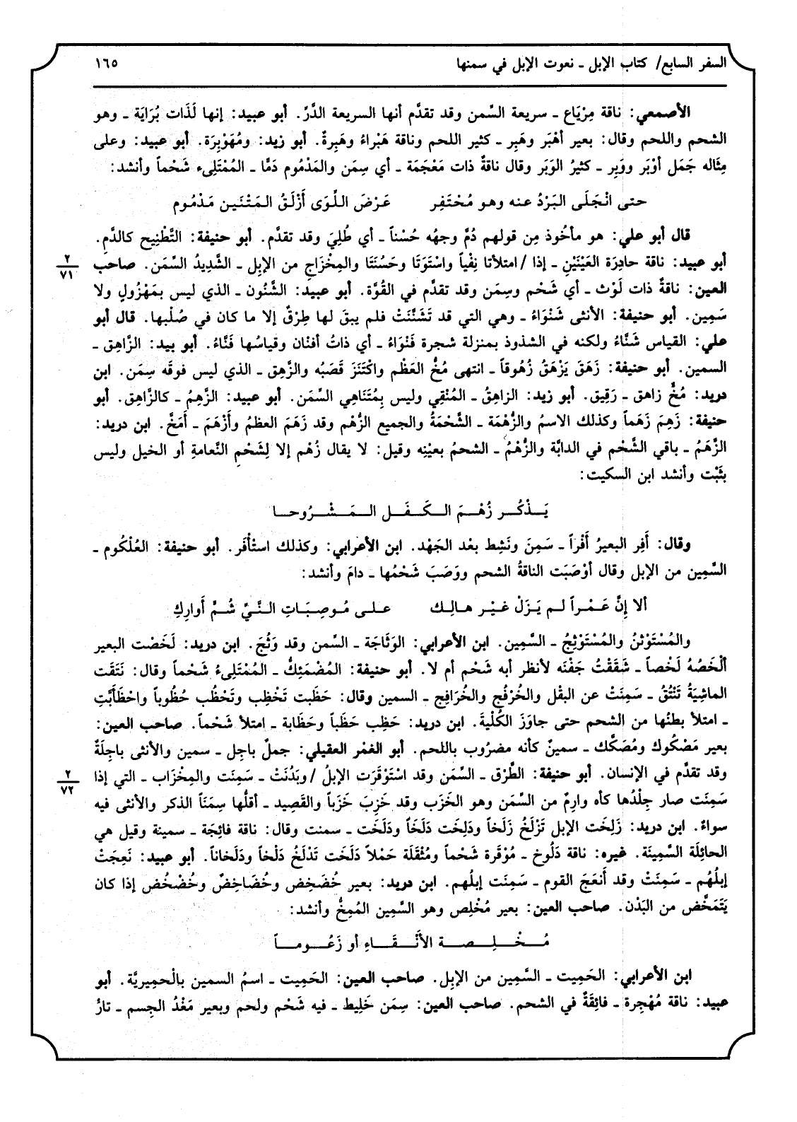 _ قَالَ أَبُو عَليّ هُوَ مأخُوذ من قَوْلهم دُمَّ وجهُه حُسْنًا أَي طُلِيَ وَقد تقدَّم أَبُو حنيفَة التَّطْنِيح كالِّدمِ أَبُو عبيد نَاقَة حادِرَة العَيْنَيْنِ إِذا امتلأتا نِفْيًا واسْتَوَتَا وحَسُنَتَا والمِخْزَاجِ من الإبِل الشَّدِيدُ السَّمَن صَاحب الْعين ناقةٌ ذَات لَوْث أَي شَحْم وسِمَن وَقد تقدَّم فِي القُوَّة أَبُو عبيد الشَّنُون الَّذِي لَيْسَ بمَهْزُولٍ وَلَا سَمِين أَبُو حنيفَة الْأُنْثَى شَنْوَاء وَهِي الَّتِي قد تَشَنَّنَتْ فَلم يبقَ لَهَا طِرْقٌ إِلَّا مَا كَانَ فِي صُلْبها قَالَ أَبُو عَليّ الْقيَاس شَنَّاُء وَلكنه فِي الشذوذ بِمَنْزِلَة شَجَرَة فَنْوَاءُ أَي ذاتُ أفنْان وقياسُها فَنَّاءُ أَبُو بيد الزَّاِهق السمين أَبُو حنيفَة زَهَقَ يَزْهَقُ زُهُوقًا انْتهى مُخُّ العَظْم واكْتَنَز قَصَبُه والزَّهِق الَّذِي لَيْسَ فوقَه سمِنَ ابْن دُرَيْد مُخُّ زاهق رَقِيق أَبُو زيد الزاهِقُ المُنْقِي وَلَيْسَ بمِتُنَاَهِي السَّمَن أَبُو عبيد الزَّهِمُ كالزاَّهِق أَبُو حنيفَة زَهِمَ زَهَمًا وَكَذَلِكَ الاسمُ والزُّهْمَة الشَّحْمَةُ والجميع الزُّهْم وَقد زَهَمَ العظمُ وأزْهَمَ أَمَخَّ ابْن دُرَيْد الزَّهَمُ بَاقِي الشَّحْم فِي الدابَّة والزُّهْمُ الشحمُ بعيْنِه وَقيل لَا يُقَال زُهْم إِلَّا لِشَحْمِ النَّعامةِ أَو الْخَيل وَلَيْسَ بثَبْت وَأنْشد ابْن السّكيت