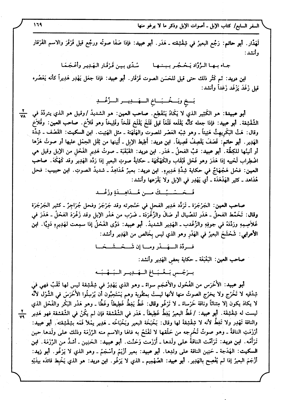 _ أَبُو عُبَيْدَة هُوَ الكَثِير الَّذِي لَا يَكَادُ يَنْقَطِع صَاحب الْعين هُوَ الشديدُ وَقيل هُوَ الَّذِي يتردَّدُ فِي الشِّقْشِقة أَبُو عبيد فَإِذا جعله كأنَّه يَقْلَعه قَلْعَاً قيل قَلَخَ يَقْلَخ قَلْخًا وقَلِيخًا وَهُوَ قَلاَّخ صَاحب الْعين وقُلاَخ وَقَالَ هَتَّ البَكْرِيهِتُّ هَتِيتًا وَهُوَ شِبْه العَصْر للصوت والهَتْهَتة مثل الهَتِيت ابْن السّكيت القَصْف شِدَّة الهَدِير أَبُو حَاتِم قَصَف يَقْصِفُ قَصِيفًا ابْن دُرَيْد أَطِيط الإبِل أنِينها من ثِقَل الحِمْل عَلَيْهَا أَو صوتُ هَزِّها أَو أنينُها للكِظِّة أَبُو عبيد قبَّ الفحلُ هَدَر ابْن دُرَيْد القَبْقَبَة صوتُ هَدِيرِ الفَحْلِ من الْإِبِل وَقيل هِيَ اضْطِراب لَحْييه إِذا هَدَرَ وَهُوَ فَحْل قَبْقَاب والكَهْكَهَة حكايةُ صوتِ البعيِر إِذا رَدَّد الهَدِير وَقد كَهْكَهَ صَاحب الْعين فحْل هَجْهَاجٌ فِي حِكَايَة شِدَّةِ هَدِيرِهِ ابْن دُرَيْد بعيٌر هُدَاهِدٌ شديدُ الصوتِ ابْن حبيب فَحل هُدَاهد كثير الَهْدَهَدة أَي يَهْدِر فِي الْإِبِل وَلَا يَقْرَعها وَأنْشد