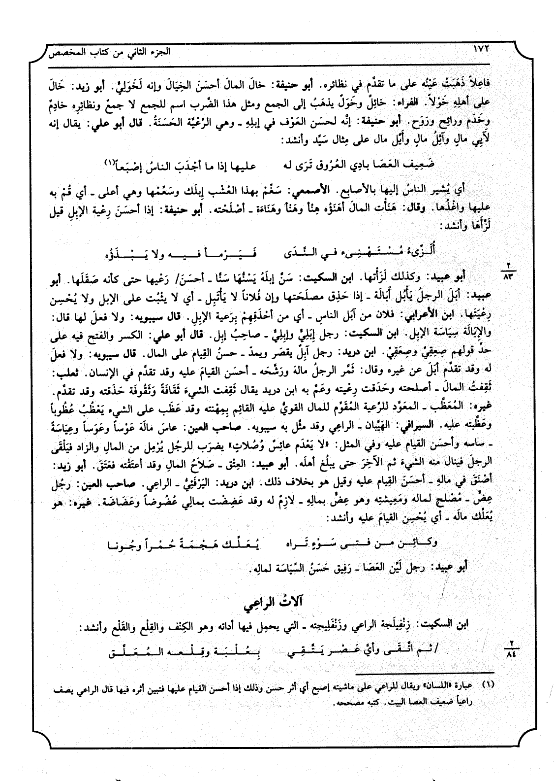 _ أَبُو عبيد وَكَذَلِكَ لزَأَتْها ابْن السّكيت سَنَّ إبلَهُ يَسْنُّهَا سَنًّا أحسَنَ رَعْيها حَتَّى كَأَنَّهُ صَقَلَها أَبُو عبيد أبَلَ الرجلُ يَأْبُل أبَالَه إِذا حَذِق مصلحَتَها وَإِن فُلانًا لَا يَأْتَبِل أَي لَا يثْبُت على الْإِبِل وَلَا يُحْسِن رِعْيَتَها ابْن الْأَعرَابِي فلَان من آبَل الناسِ أَي من أحْذَقِهِم بِرَعية الإبِل قَالَ سِيبَوَيْهٍ وَلَا فعلَ لَهَا قَالَ والإبَالَة سِيَاسَة الإبِل ابْن السّكيت رجل إِبَلِيٌّ وإبِلِيٌّ صاحِبُ إبِل قَالَ أَبُو عَليّ الْكسر وَالْفَتْح فِيهِ على حدِّ قَوْلهم صِعِقِيِّ وصِعَقِيِّ ابْن دُرَيْد رجل آبِلُ بقصَر ويمدّ حسنُ القِيام على المَال قَالَ سِيبَوَيْهٍ وَلَا فعلَ لَهُ وَقد تقدَّم أبَلَ عَن غَيره وَقَالَ ثَمَّر الرجلُ مالهَ ورَشَّحَه أحسَن القيامَ عَلَيْهِ وَقد تقدَّم فِي الْإِنْسَان ثَعْلَب ثَقِفتُ المالَ أصلحته وحَدَقت رِعْيته وعَمَّ بِهِ ابْن دُرَيْد يُقَال ثَقِفت الشيءَ ثَقَافَةً وَثَقُوفَة حَذَقته وَقد تقدَّم غَيره المُعَظَّب المعَوَّد للرَّعية المقُوَمِّ لِلْمَالِ القويُّ عَلَيْهِ القائِم بمِهِنْته وَقد عَظَب على الشَّيْء يَعْظُبُ عُظُوباً وعَظَّبته عَلَيْهِ السيرافي الَهَّيبان الراعِي وَقد مثَّل بِهِ سِيبَوَيْهٍ صَاحب الْعين عاسَ مالَهَ عَوْسًا وعَوَسًا وعِيَاسَةٌ ساسه وأحسَن الْقيام عَلَيْهِ وَفِي الْمثل // (لَا يَعْدَم عائِسٌ وُصُلاتٍ) // يضرَب للرجُل يُرْمِل من المالِ والزاد فيَلْقَى الرجلَ فينال مِنْهُ الشيءَ ثمَّ الآخِرَ حَتَّى يبلُغ أهلَه أَبُو عبيد العِتْق صَلاَحُ المالِ وَقد أعتَقْته فعَتَقَ أَبُو زيد أصْنَقَ فِي مالهِ أحسَنَ القِيام عَلَيْهِ وَقيل هُوَ بِخِلَاف ذَلِك ابْن دُرَيْد اليَرْفَئِيُّ الراعِي صَاحب الْعين رجُل عِضَّ مُصْلح لمَاله ومَعِيشتِه وَهُوَ عِضٌّ بمالِهِ لازِمٌ لَهُ وَقد عَضِضْت بماِلي عُضُوضًا وعَضَاضَة غَيره هُوَ يُعَلِّك مالَه أَي يُحْسِن القيامَ عَلَيْهِ وَأنْشد