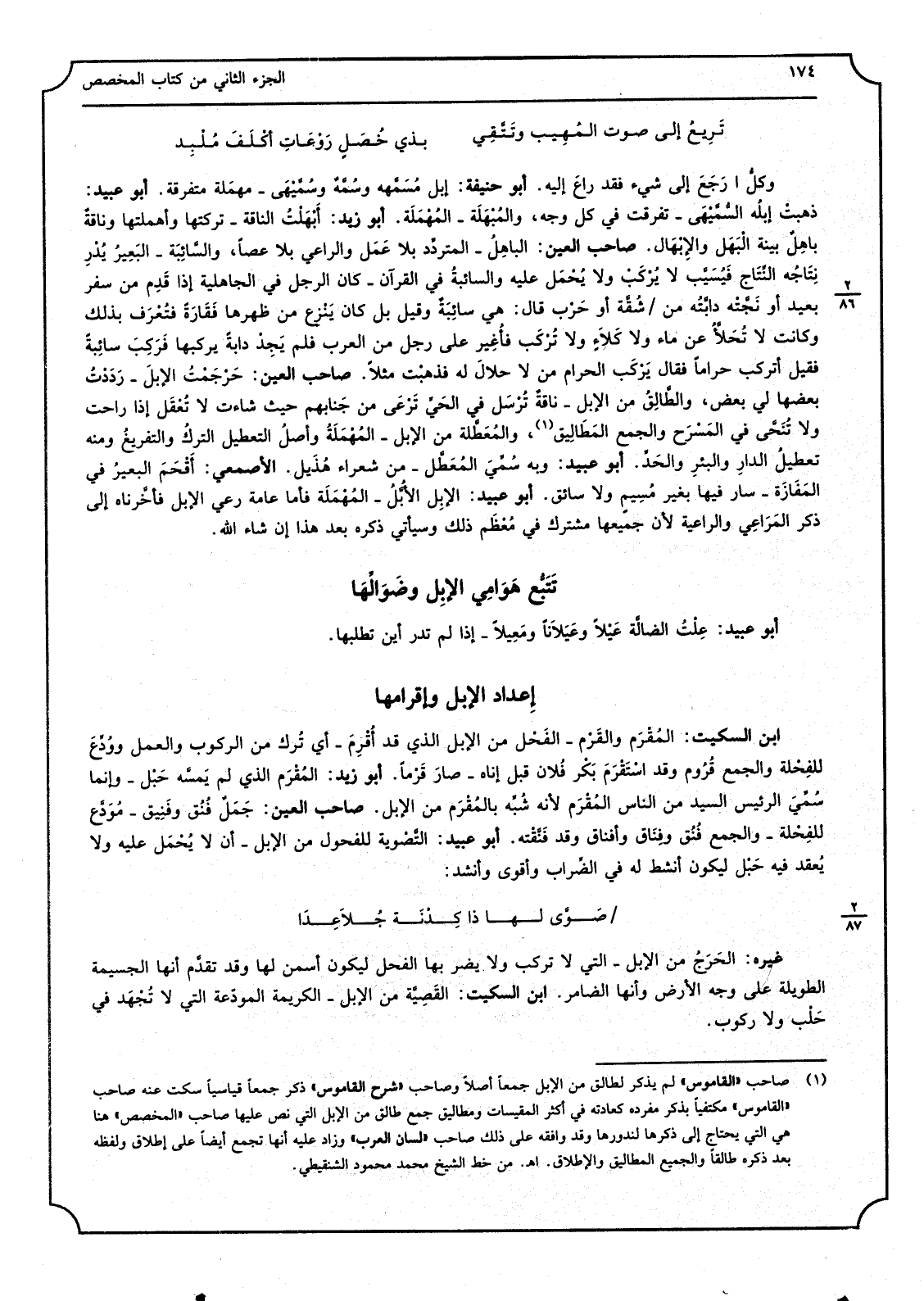 _ وكلُّ رَجَعَ إِلَى شَيْء فقد راعَ إِلَيْهِ أَبُو حنيفَة إبل مَسَمَّهه وسُمَّهٌ وسُمَّيْهَى مهمَلة مُتَفَرِّقَة أَبُو عبيد ذهبتْ إبلُه السُّمَّيْهَى تَفَرَّقت فِي كل وَجه والمُبْهَلَة المُهْمَلَة أَبُو زيد أبْهَلْتُ النَّاقة تركتهَا وأهملتها وناقةٌ باهِلٌ بَيِّنَة الْبَهَل والإبْهَال صَاحب الْعين الباهِلُ المتردِّد بِلَا عَمَل والراعي بِلَا عَصا والسَّائِبَة البَعَيرُ يُدْرِ نِتَاجُه النِّتَاج فَيُسَيَّب لَا يُرْكَبْ وَلَا يُحْمَل عَلَيْهِ والسائبةُ فِي القرآ ن كَانَ الرجل فِي الْجَاهِلِيَّة إِذا قَدِم من سفر بعيد أَو نَجَّتْه دابَّتُه من شُقَّة أَو حَرْب قَالَ هِيَ سائِبَةٌ وَقيل بل كَانَ يَنْزِع من ظهرهَا فَقَارَةٌ فتُعْرَف بذلك وَكَانَت لَا تُحَّلأُ عَن مَاء وَلَا كَلاَءٍ وَلَا تُرْكَب فأُغِير على رجل من الْعَرَب فَلم يَجِدْ دابةٌ يركبهَا فَرَكِبَ سائِبةٌ فَقيل أتركب حرامٌا فَقَالَ يَرْكَب الْحَرَام من لَا حلالَ لَهُ فذهبْت مثلا صَاحب الْعين حَرْجَمْتُ الإبلَ رَدَدْتُ بَعْضهَا لي بعض والطَّاِلُق من الْإِبِل ناقةٌ تُرْسَل فِي الحَيِّ تَرْعَى من جَنابهم حَيْثُ شَاءَت لَا تُعْقَل إِذا راحت وَلَا تُنَحَّى فِي المَسْرَح وَالْجمع المَطَالِيق والمُعَطَّلة من الْإِبِل المُهْمَلَةُ وأصلُ التعطيل التركُ والتفريغُ وَمِنْه تعطيلُ الدارِ والبئرِ والحَدِّ أَبُو عبيد وَبِه سُمِّيَ المُعَطَّل من شعراء هُذَيل الْأَصْمَعِي أَقْحَمَ البعيرُ فِي المَفَازَة سَار فِيهَا بِغَيْر مُسِيمٍ وَلَا سائق أَبُو عبيد الإبِل الأُبَّلُ المُهْمَلَة فَأَما عَامَّة رعي الْإِبِل فأخَّرناه إِلَى ذكر المَرَاعِي والراعية لِأَن جَمِيعهَا مُشْتَرك فِي مُعْظَم ذَلِك وَسَيَأْتِي ذكره بعد هَذَا إِن شَاءَ الله