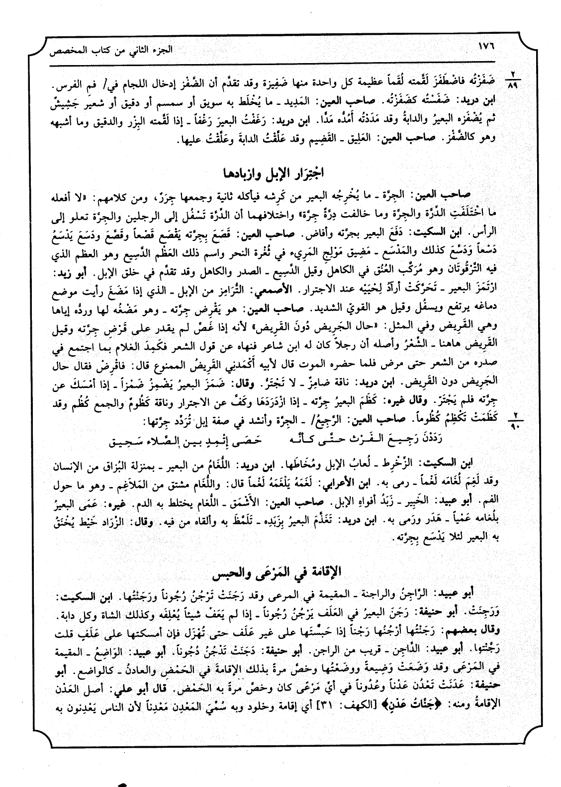 3 - أَبُو عبيد الرَّاِجُن والراجنة المقيمة فِي المرعى وَقد رَجَنَتْ تَرْجُنُ رُجُونًا ورَجَنْتُها ابْن السّكيت ورَجِنَتْ أَبُو حنيفَة رَجَنَ البعيرُ فِي العَلَف يَرْجُنُ رُجُونًا إِذا لم يَعَفْ شَيْئا يُعْلِفَه وَكَذَلِكَ الشَّاة وكل دَابَّة وَقَالَ بَعضهم رَجَنْتُها أرْجُنُها رَجْنًا إِذا حَبستَها على غير عَلَف حَتَّى تُهْزَل فَإِن أَمْسَكتهَا على عَلَفٍ قلت رَجَّنْتها أَبُو عبيد الدَّاجِن قريب من الراجن أَبُو حنيفَة دَجَنَتْ تَدْجُنُ دُجُونًا أَبُو عبيد الوَاضِعُ المقيمة فِي المَرْعَى وَقد وَضَعَتْ وَضِيعةٌ ووضَعْتُها وخصَّ مرةٌ بذلك الإقامةَ فِي الحَمْض والعادنُ كالواضع أَبُو حنيفَة عَدَنَتْ تعَدْنُ عَدْنًا وعُدُونًا فِي أيِّ مَرْعَى كَانَ وخصَّ مرةٌ بِهِ الحَمْض قَالَ أَبُو عَليّ أصل العَدْن الإقامةُ وَمِنْه جَنَّاتُ عَدْنٍ الْكَهْف 31 أَي إِقَامَة وخلود وَبِه سُمِّيَ المَعْدِن مَعْدِنًا لِأَن النَّاس يَعْدِنون بِهِ