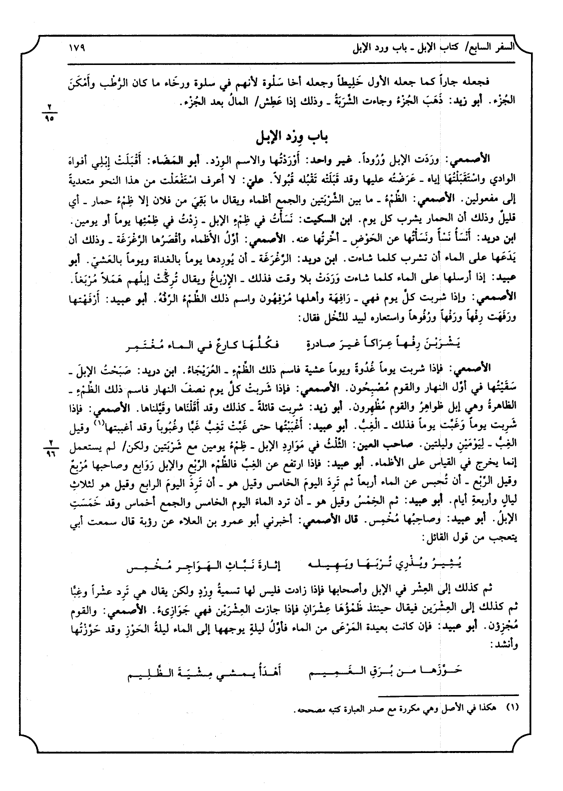 3 - الْأَصْمَعِي وَرَدَت الْإِبِل وُرُودًا غير وَاحِد أَوْرَدْتُها وَالِاسْم الوِرْد أَبُو المَضَاء أَقْبَلَتْ إِبْلِي أفواهَ الْوَادي واسْتَقَبَلْتُهَا إِيَّاه عَرَضْتُه عَلَيْهَا وَقد قَبَلَتْه تَقْبُله قُبُولاً عليّ لَا أقرف اسْتَفْعَلْت من هَذَا النَّحْو متعديةٌ إِلَى مفعولين الْأَصْمَعِي الظِّمْءُ مَا بَين الشَّرْبَتين وَالْجمع أظماء وَيُقَال مَا بَقِيَ من فلَان إِلَّا ظِمْءُ حمَار أَي قليلٌ وَذَلِكَ أَن الْحمار يشرب كل يَوْم ابْن السّكيت نَسَأْتُ فِي ظِمْءِ الْإِبِل زِدْتُ فِي ظِمْئِها يَوْمًا أَو يَوْمَيْنِ ابْن دُرَيْد أَنْسَأُ نَسْأً ونَسَأْتُها عَن الحَوْضِ أخَّرتُها عَنهُ الْأَصْمَعِي أوَّلُ الأَظماء وأقْصَرُها الرَّغْرَغَة وَذَلِكَ أَن يَدَعَها على المَاء أَن تشرب كلما شَاءَت ابْن دُرَيْد الرَّغْرَغَة أَن يُورِدها يَوْمًا بِالْغَدَاةِ وَيَوْما بالعَشيّ أَبُو عبيد إِذا أرسلها على المَاء كلما شَاءَت وَرَدَتْ بِلَا وَقت فَذَلِك الإِرْباغُ وَيُقَال تُرِكَتْ إبلُهم هَمَلاً مُرْبَغًا الْأَصْمَعِي وَإِذا شربت كلَّ يَوْم فَهِيَ رَافِهَة وَأَهْلهَا مُرْفِهُون وَاسم ذَلِك الظِّمْءُ الرِّفْهُ أَبُو عبيد أرْفَهْتها ورَفَهَت رِفْهًا ورَفْهاً ورُفُوهًا واستعاره لبيد للنَّخْل فَقَالَ