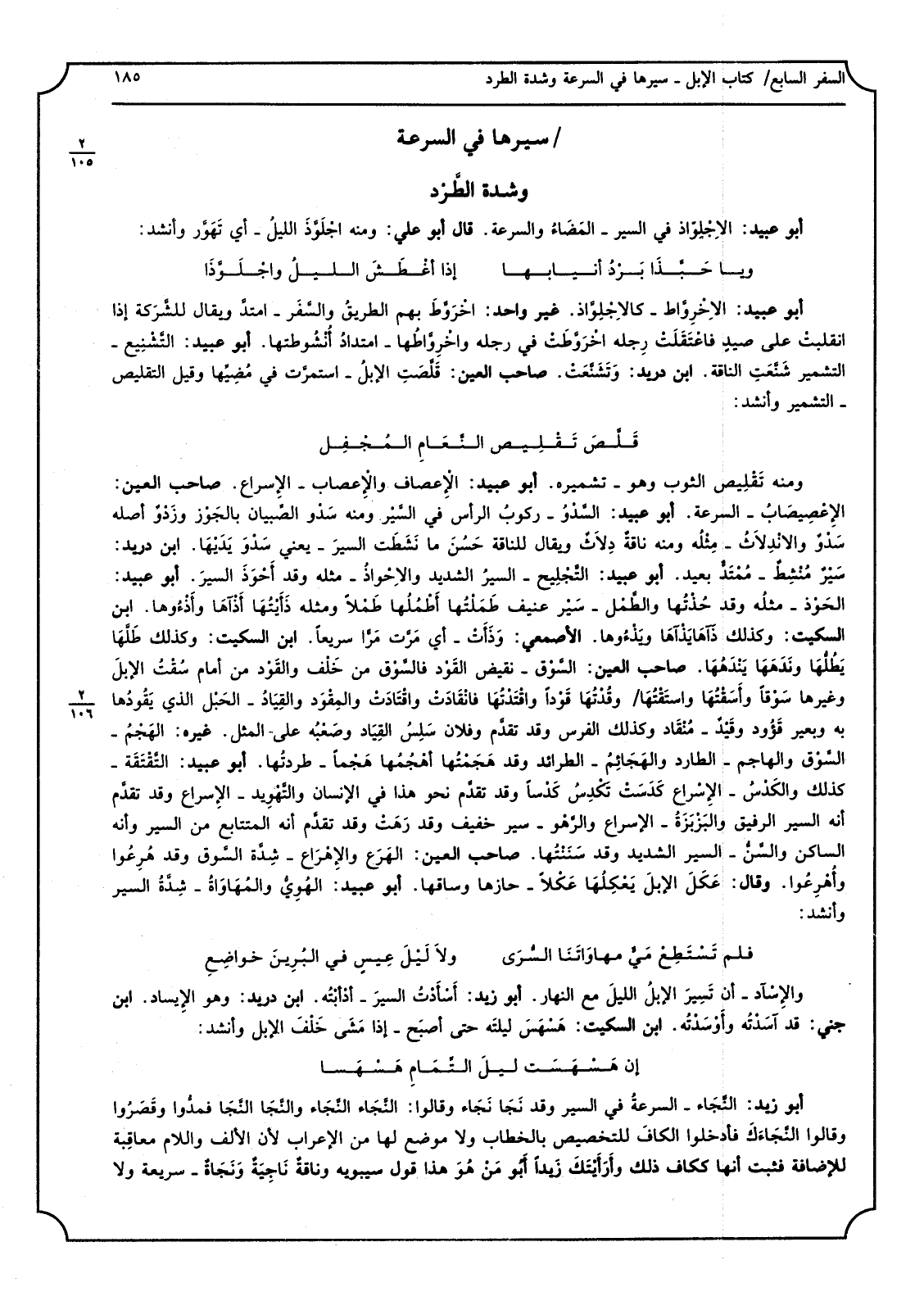 _ وَمِنْه تَقْلِيص الثَّوْب وَهُوَ تشميره أَبُو عبيد اْلإِعصاف واْلإِعصاب الإِسراع صَاحب الْعين الإِعْصِيصَابُ السرعة أَبُو عبيد السَّدْوُ ركوبُ الرَّأْس فِي السَّيْر وَمِنْه سَدْو الصِّبيان بالجَوْز وزَدْوٌ أَصله سَدْوٌ والاْنِدلاَثُ مِثْلُه وَمِنْه ناقةٌ دِلاَثٌ وَيُقَال للناقة حَسُنَ مَا نَشَطَت السيرَ يَعْنِي سَدْوَ يَدَيْهَا ابْن دُرَيْد سَيْرٌ مُنْشِطٌ مُمْتَدٌّ بعيد أَبُو عبيد التَّجْلِيح السيرُ الشَّديد والاِحْواذُ مثله وَقد أَحْوَذَ السيرَ أَبُو عبيد الحَوْذ مثلُه وَقد جُذْتُها والطِّمْل سَيْر عنيف طَمَلْتُها أَطْمُلُها طَمْلاً وَمثله ذَأَيْتُهَا أَذْآهَا وأَذْءُوها ابْن السّكيت وَكَذَلِكَ ذَآهَايَذْآهَا وبَذْءُوها الْأَصْمَعِي وَذَأَتْ أَي مَرَّت مَرَّا سَرِيعا ابْن السّكيت وَكَذَلِكَ طَلَّهَا يَطُلُّهَا ونَدَهَهَا يَنْدَهُهَا صَاحب الْعين السَّوْق نقيض القَوْد فالسَّوْق من خَلْف والقَوْد من أَمَام سُقْتُ الإبلَ وَغَيرهَا سَوْقًا وأَسَقْتُهَا واستَقْتُهَا وقُدْتُهَا قَوْدًا واقْتَدْتُهَا فانْقَادَتْ واقْتَادَتْ والِمْقَوَد والقِيَادُ الحَبْلُ الَّذِي يَقُودُها بِهِ وبعير قَؤُود وقَيْدٌ مُنْقَاد وَكَذَلِكَ الْفرس وَقد تقدَّم فلَان سَلِسُ القِيَاد وصَعْبُه على الْمثل غَيره الهَجْمُ السَّوْق والهاجم الطارد والهَجَائِمُ الطرائد وَقد هَجَمْتُها أَهْجُمُها هَجْمًا طردتُها أَبُو عبيد التَّقْتَقَة كَذَلِك والكَدْسُ الإِسْراع كَدَسَتْ تَكْدِسُ كَدْسًا وَقد تقدَّم نَحْو هَذَا فِي الْإِنْسَان والتَّهْوِيد الإِسراع وَقد تقدَّم أَنه السّير الرفيق والبَزْبَزَةُ الْإِسْرَاع والرَّهْو سير خَفِيف وَقد رَهَتْ وَقد تقدَّم أَنه المتتابع من السّير وَأَنه السَّاكِن والسَّنُّ السّير الشَّديد وَقد سَنَنْتُها صَاحب الْعين الهَرَع والإِهْرَاع شِدَّة السَّوق وَقد هُرِعُوا وأُهْرِعُوا وَقَالَ عَكَلَ الإبلَ يَعْكِلُهَا عَكْلاَ حازها وساقها أَبُو عبيد الهُوِيُّ والمُهَاوَاةُ شِدَّةُ السّير وَأنْشد