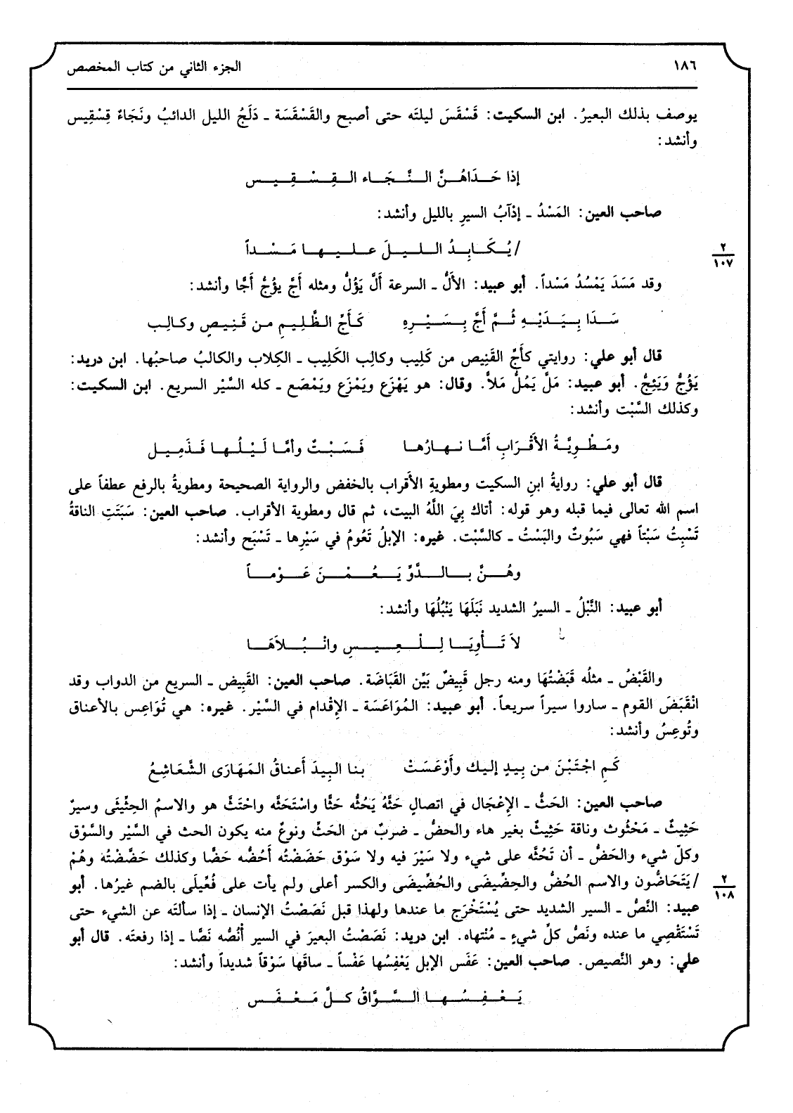 _ صَاحب الْعين الحَثُّ الإِعْجَال فِي اتصالٍ حَثَّهُ يَحُثُّه حَثًّا واسْتَحَثَّه واحْنَثَّ هُوَ والاسمُ الحِثِّيثَى وسيرٌ حَثِيثٌ مَحْثُوث وناقة حَثِيثٌ تغير هَاء والحضُّ ضربٌ من الحَثِّ ونوعٌ مِنْهُ يكون الْحَث فِي السَّيْر والسَّوْق وكلّ شَيْء والحَضُّ أَن تَحُثَّه على شَيْء وَلَا سَيْرَ فِيهِ وَلَا سَوْق حَضَضْتُه أَحُضُّه حَضًّا وَكَذَلِكَ حَضِّضْتُه وهُمْ يَتَحَاضُّون وَالِاسْم الحُضُّ والحِضِّيضَى والحضيضى وَالْكَسْر أَعلَى وَلم يَأْتِ على فُعِّيلَى بِالضَّمِّ غيرُها أَبُو عبيد النَّصُّ السّير الشَّديد حَتَّى يُسْتَخْرَج مَا عِنْدهَا وَلِهَذَا قبل نَصَصْتُ الْإِنْسَان إِذا سألتَه عَن الشَّيْء حَتَّى تَسْتَقْصِي مَا عِنْده ونَصُ كلِّ شيءٍ مُنْتهاه ابْن دُرَيْد نَصَصْتُ البعيرَ فِي السّير أَنُصُّه نَصًّا إِذا رفعتَه قَالَ أَبُو عَليّ وَهُوَ النَّصيص صَاحب الْعين عَفَس الْإِبِل يَعْفِسُها عَفْسًا ساقَها سَوْقًا شَدِيدا وَأنْشد