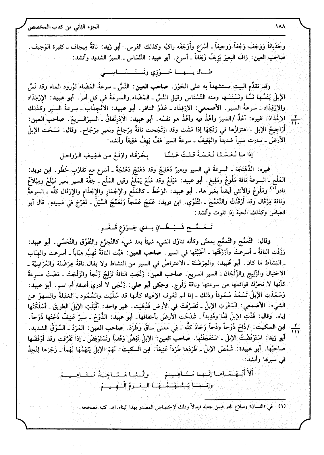 _ وَقَالَ التَّعَمُّج والتَّمعُّج بمعنَى وَكَأَنَّهُ تناوُل الشَّيْء شَيْئا بعد شَيْء كالتَّجرُّع والتَّفَوُّق والتَّحَسِّي أَبُو عبيد رَزَفَتِ الناقةُ أسرعتْ وأرْزَفْتُها أخْبَبْتُها فِي السّير صَاحب الْعين هَبَّت الناقةُ تَهِبُّ هِبَابًا أسرعت والهِبَاب النشاط مَا كَانَ أَبُو عبيد والعِرَضْنَة الاعتراضُ فِي السّير من النشاط وَلَا يُقَال ناقةٌ عِرَضْنَة والعُرْضِيَّة الاختيال والزَّلِيج والزَّلَجَان السّير السَّرِيع صَاحب الْعين زَلَجَتِ الناقةُ تَزْلِجُ زَلْجًا وانْزَلَجَتْ مَضَتْ مسرِعةُ كَأَنَّهَا لَا تحرِّك قَوَائِمهَا من سرعتها وناقة زَلُوج وَحكى أَبُو عَليّ زَلَجَى لَا أَدْرِي أصفة أم اسْم أَبُو عبيد وَسَمَدَتِ الإبلُ تَسْمُدُ سُمُودًا وَذَلِكَ إِذا لم تَعْرِف الإعياءَ كَأَنَّهَا قد سُلْيَت والسُّمُود الغفلةُ والسهوُ عَن الشَّيْء الْأَصْمَعِي انْسَفَرتِ الإبلُ تَصَرَّفَتْ فِي الأَرْض فَذَهَبَت غير وَاحِد أقْبَلَتِ الإبلَ الطريقَ أسْلَكْتُها إِيَّاه وَقَالَ فَدَّتِ الإبلُ فَدًا وفَدِيدًا شَدَخَت الارضَ بأخفافها أَبُو عبيد الذَّوْحُ سيرٌ عَنِيفٌ ذُحْتُها ذَوْحًا ابْن السّكيت ذَاحَ ذَوْحًا وذَحًا وحَاذَ كلُّه فِي معنى ساقَ وطَرَدَ صَاحب الْعين المَرْاُد السَّوْقُ الشَّديد أَبُو زيد اسْتَوْفَضْتُ الإبلَ اسْتَعْجْلُتها صَاحب الْعين الإبلُ تَقِضُّ وَفْضًا وتَسْتَوْفِضُ إِذا تَفَرَّقَت وَقد أَوْفَضَها صاحبُها أَبُو عُبَيْدَة شَمَّصَ الإبلَ طَرَدَها طَرْدًا عنيفًا ابْن السّكيت نَهَمَ الإبلَ يَنْهَمُهَا نَهْمًا زَجَرَها لِتُجِدِّ فِي سَيرهَا وَأنْشد