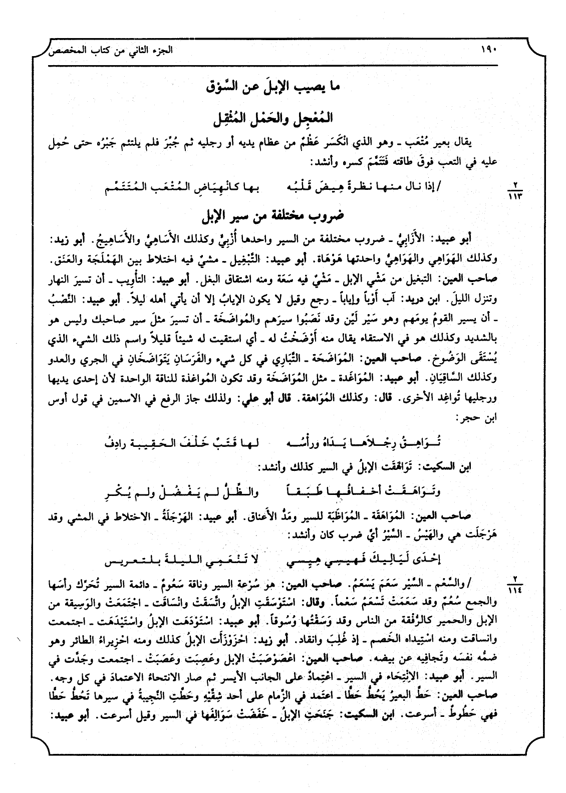 3 - أَبُو عبيد الأَزَابِيُّ ضروب مُخْتَلفَة من السّير وَاحِدهَا أُزْبِيٌّ وَكَذَلِكَ الأَسَاهِيُّ والأَسَاهِيجُ أَبُو زيد وَكَذَلِكَ الهَوَاهِي والهَوَاهِيُّ واحدتها هَوْهَاة أَبُو عبيد التَّبْغِيل مشيٌ فِيهِ اخْتِلَاط بَين الهَمْلَجَة والعَنَق صَاحب ابعين التبغيل من مَشْي الْإِبِل مَشْيٌ فِيهِ سَعَة وَمِنْه اشتقاق الْبَغْل أَبُو عبيد التأوِيب أَن تسيرَ النَّهَار وتنزل الليلَ ابْن دُرَيْد آب أَوْبًا وإيابًا رَجَعَ وَقيل لَا يكون الإيابُ إِلَّا أَن يَأْتِي أَهله ليلاٌ أَبُو عبيد النَّصْبُ أَن يسير القومُ يومَهم وَهُوَ سَيْر لَيِّن وَقد نَصَبُوا سيرَهم والمُواضَخَة أَن تسيرَ مثلَ سير صَاحبك وَلَيْسَ هُوَ بالشديد وكذ لَك هُوَ فِي الاستقاء يُقَال مِنْهُ أَوْضَخْتُ لَهُ أَي استقيت لَهُ شَيْئا قَلِيلا وَاسم ذَلِك الشئ الَّذِي يُسْتَقَى الوَضُوخ صَاحب الْعين المُوَاضَحَة التَّبَارِي فِي كل شئ والفَرَسَانِ يَتَوَاضَخَانِ فِي الجري والعدو وَكَذَلِكَ السَّاقِيَانِ أَبُو عبيد المُوَاغَدة مثل المُوَاضَخَة وَقد تكون المُواغذة للناقة الْوَاحِدَة لِأَن إِحْدَى يَديهَا ورجليها تُواغِد الْأُخْرَى قَالَ وَكَذَلِكَ المُوَاهقة قَالَ أَبُو عَليّ وَلذَلِك جَازَ الرّفْع فِي الاسمين فِي قَول أَوْس ابْن حجر